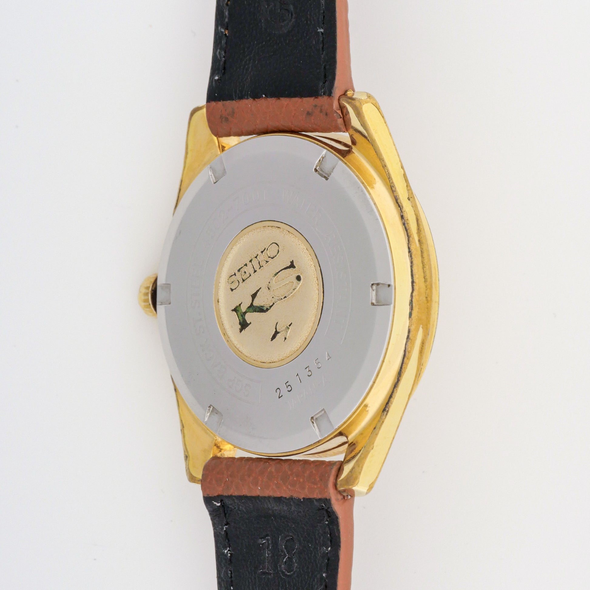 - Case: Moderate wear with visible plating loss on lugs and edges exposing base metal. Surface scratches throughout, particularly on bezel and case flanks. Case back shows light scratching with KS medallion intact.