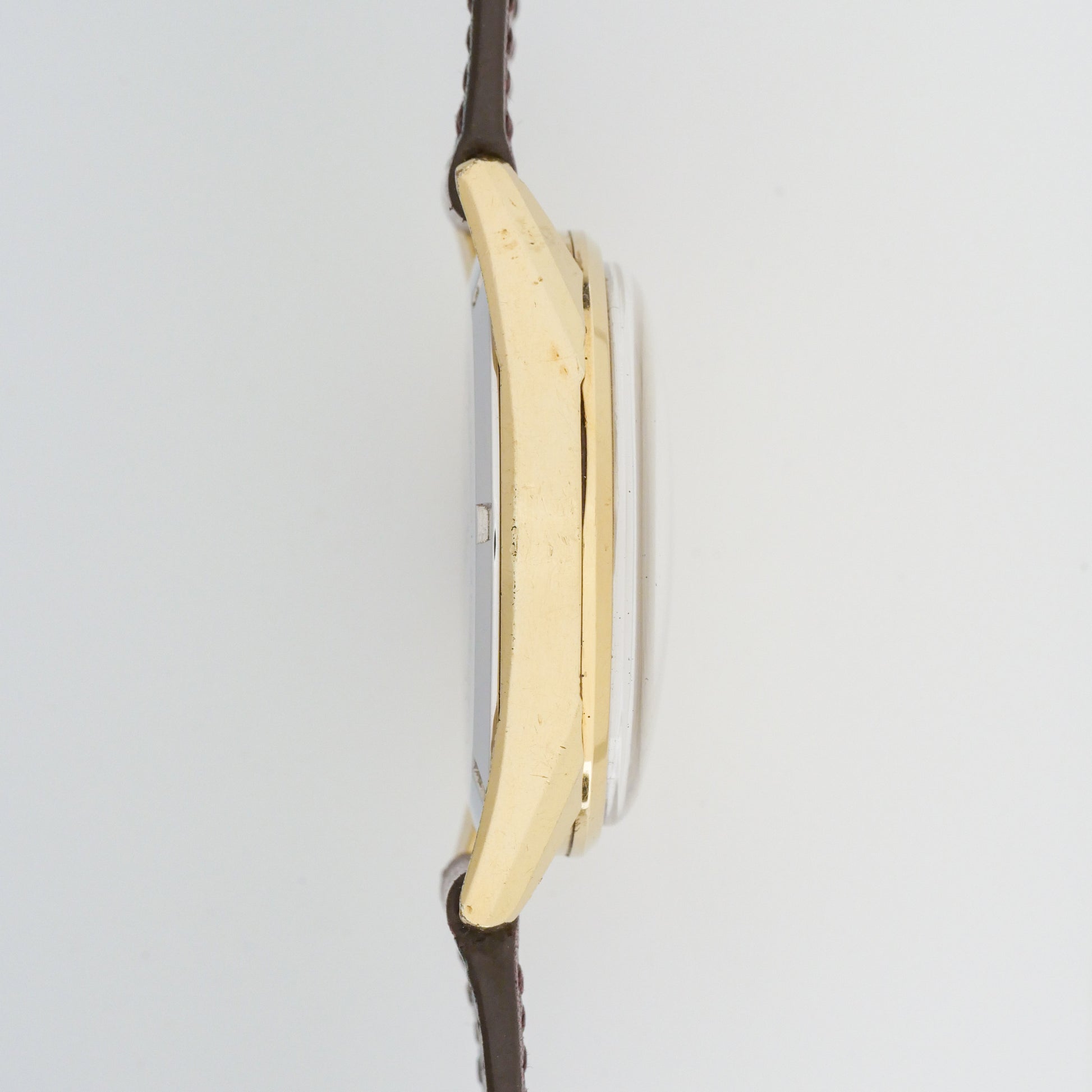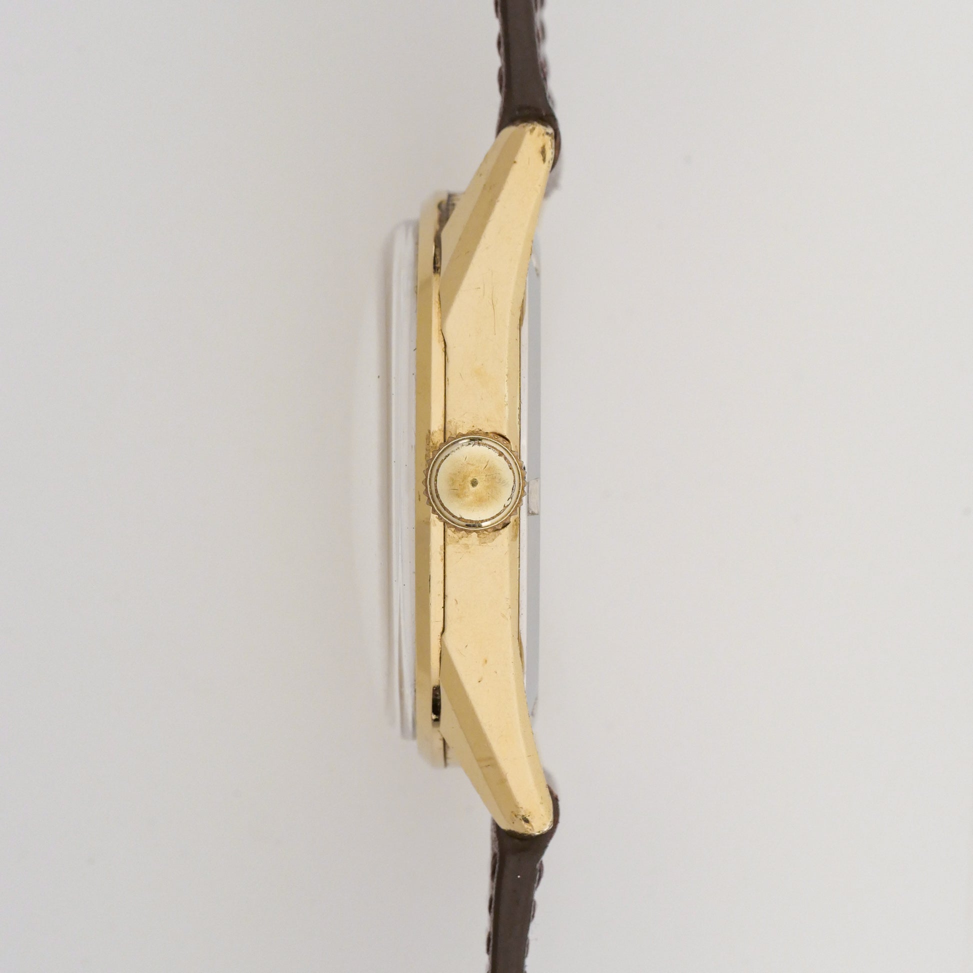 - Case: shows moderate wear consistent with age and use. There are visible scratches and scuffs throughout the case surfaces, with some areas showing signs of plating wear. The lugs display scratching and minor dings, and the overall finish has lost some of its original luster. The case back has light scratches but remains readable.