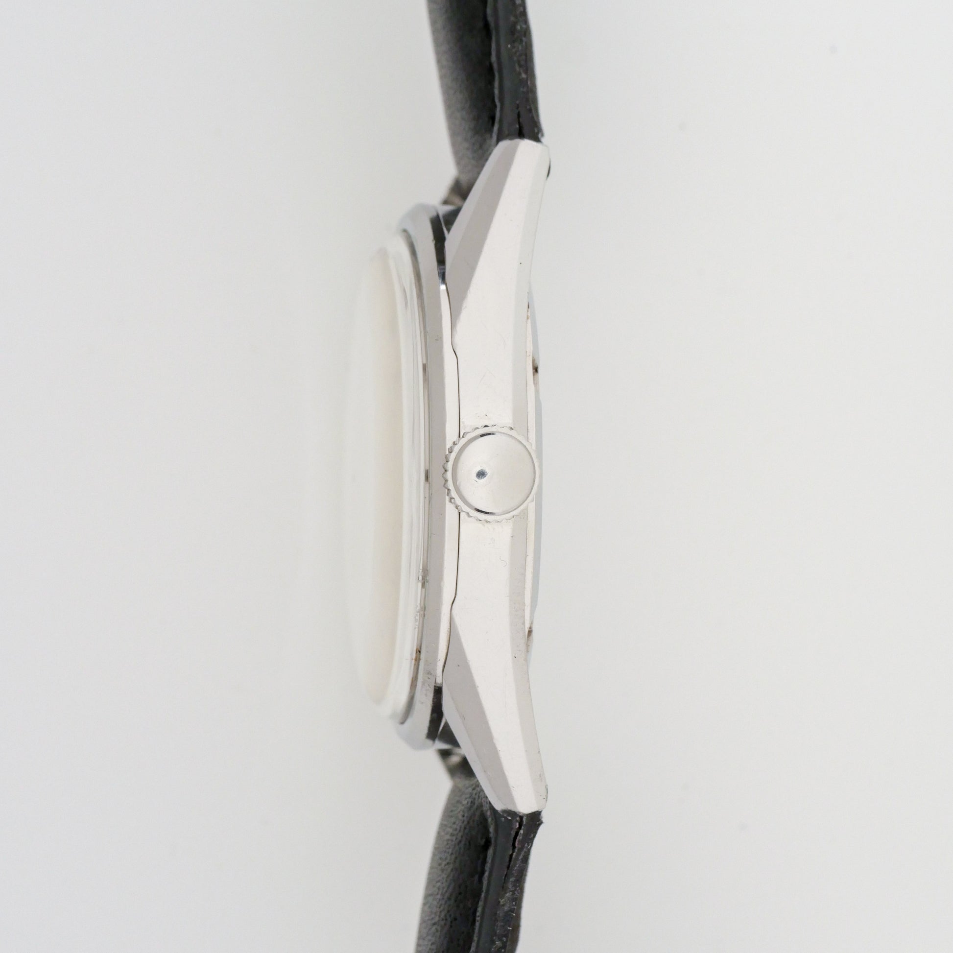 - Case: shows moderate wear consistent with regular use. There are visible scratches and scuffs throughout the case surfaces, particularly noticeable on the sides and lugs. The polished surfaces have lost some of their original luster, showing a somewhat dulled finish with minor dings and marks from daily wear.