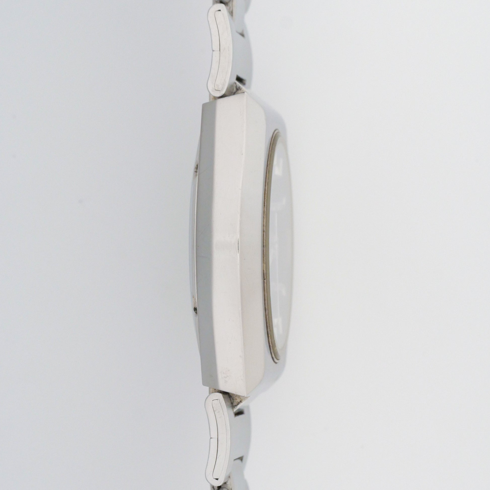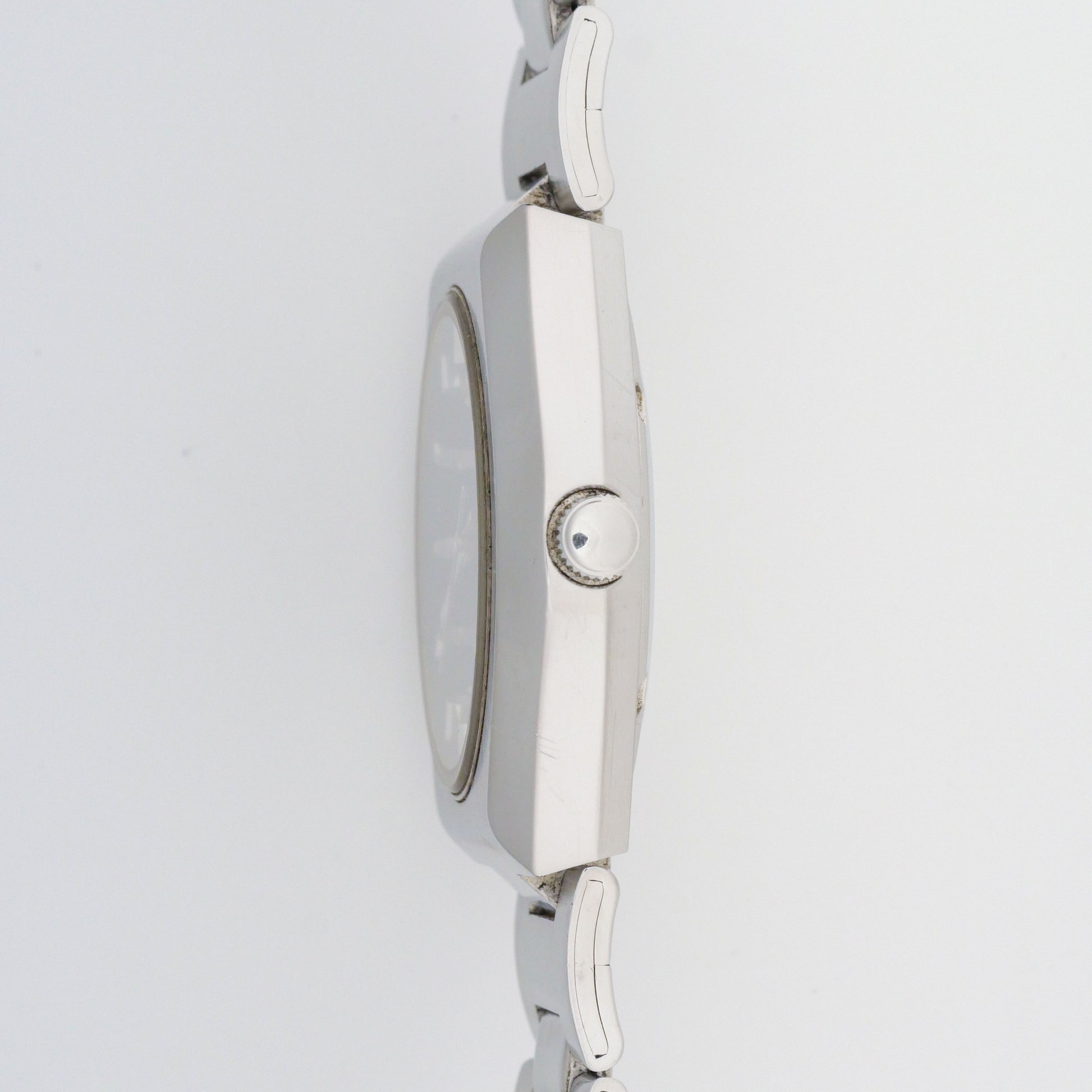 - Case: shows moderate wear with surface scratches, scuff marks, and minor dings throughout. The brushed finish has worn unevenly in areas. The bracelet displays similar wear patterns on links and clasp, consistent with age and regular use.