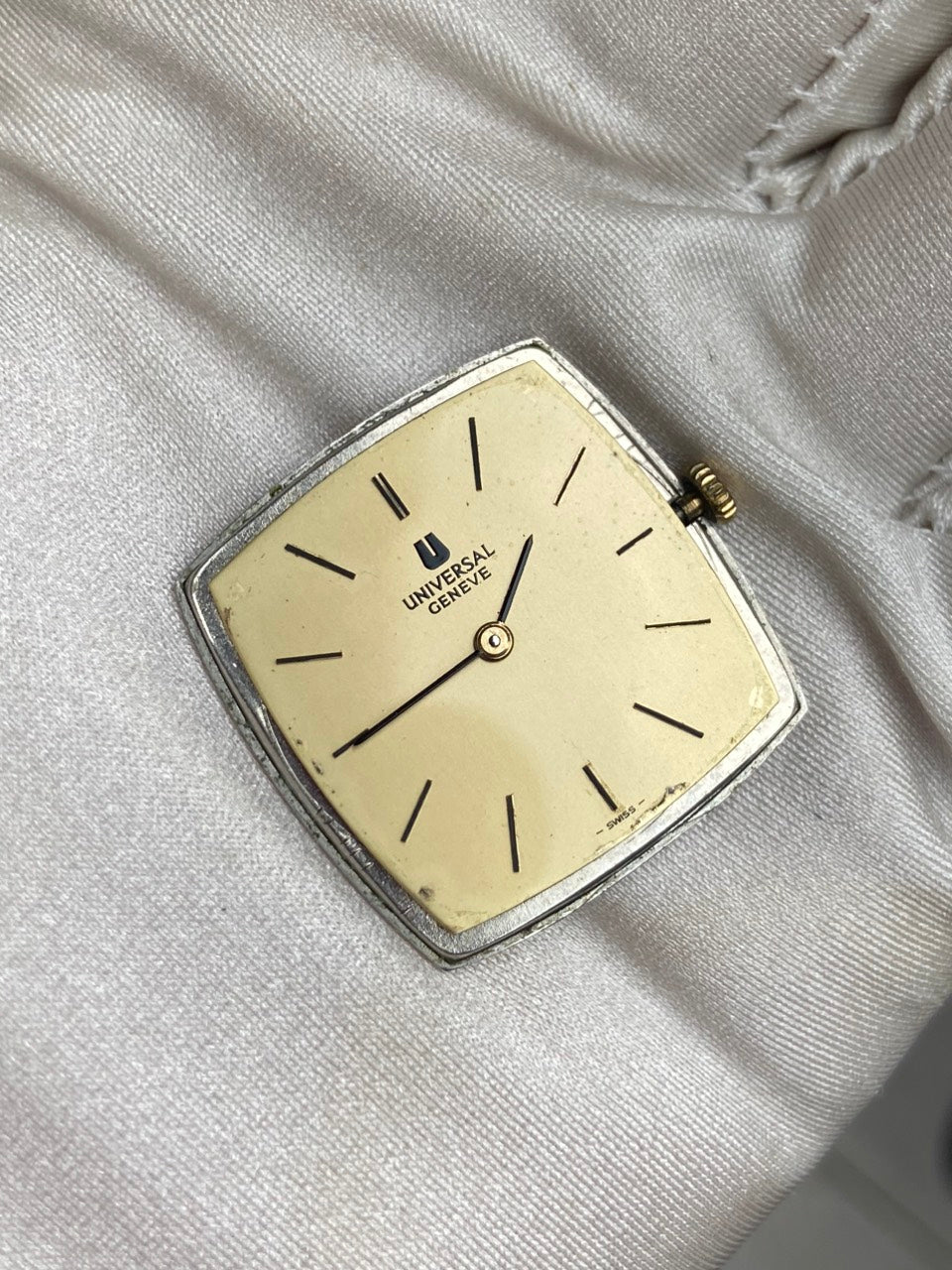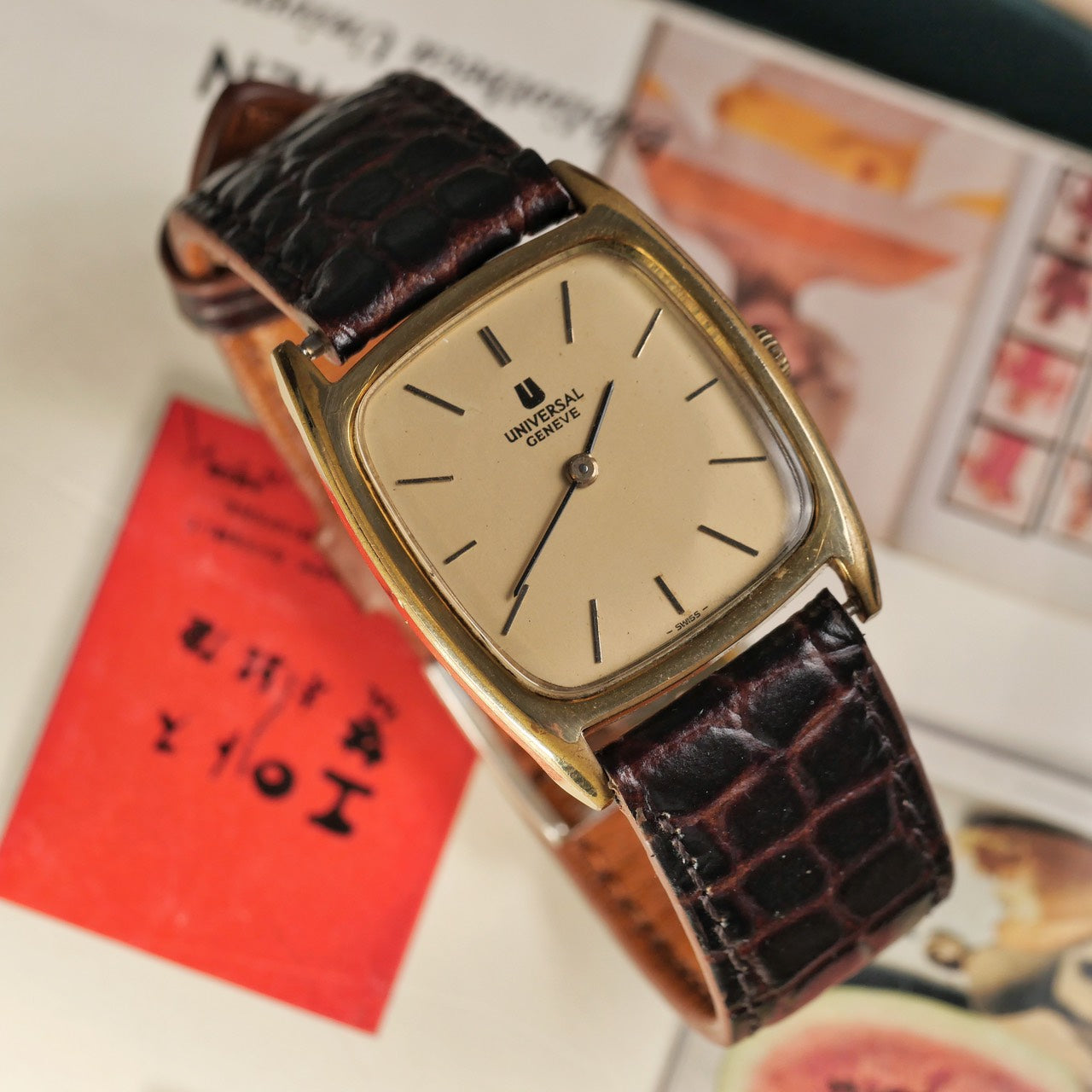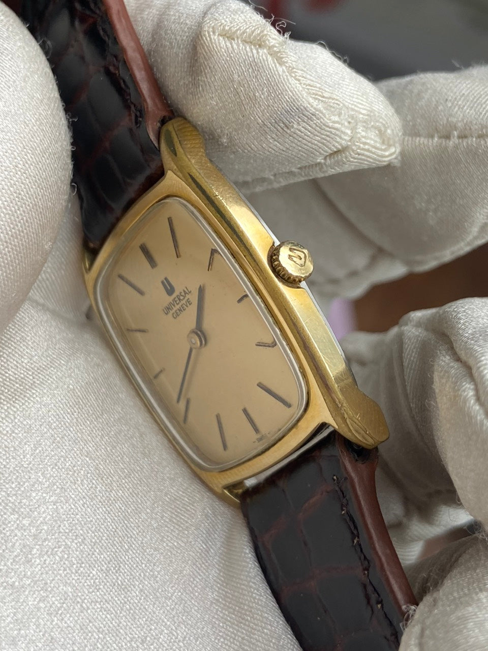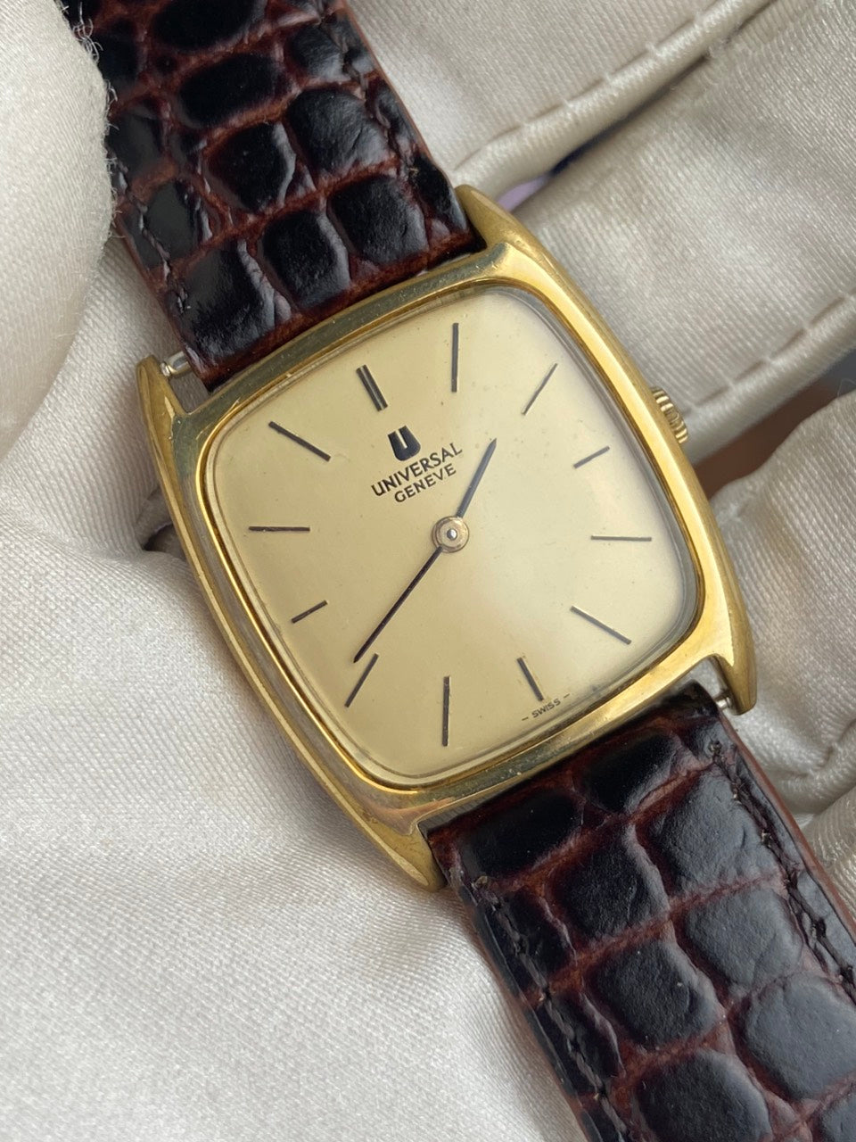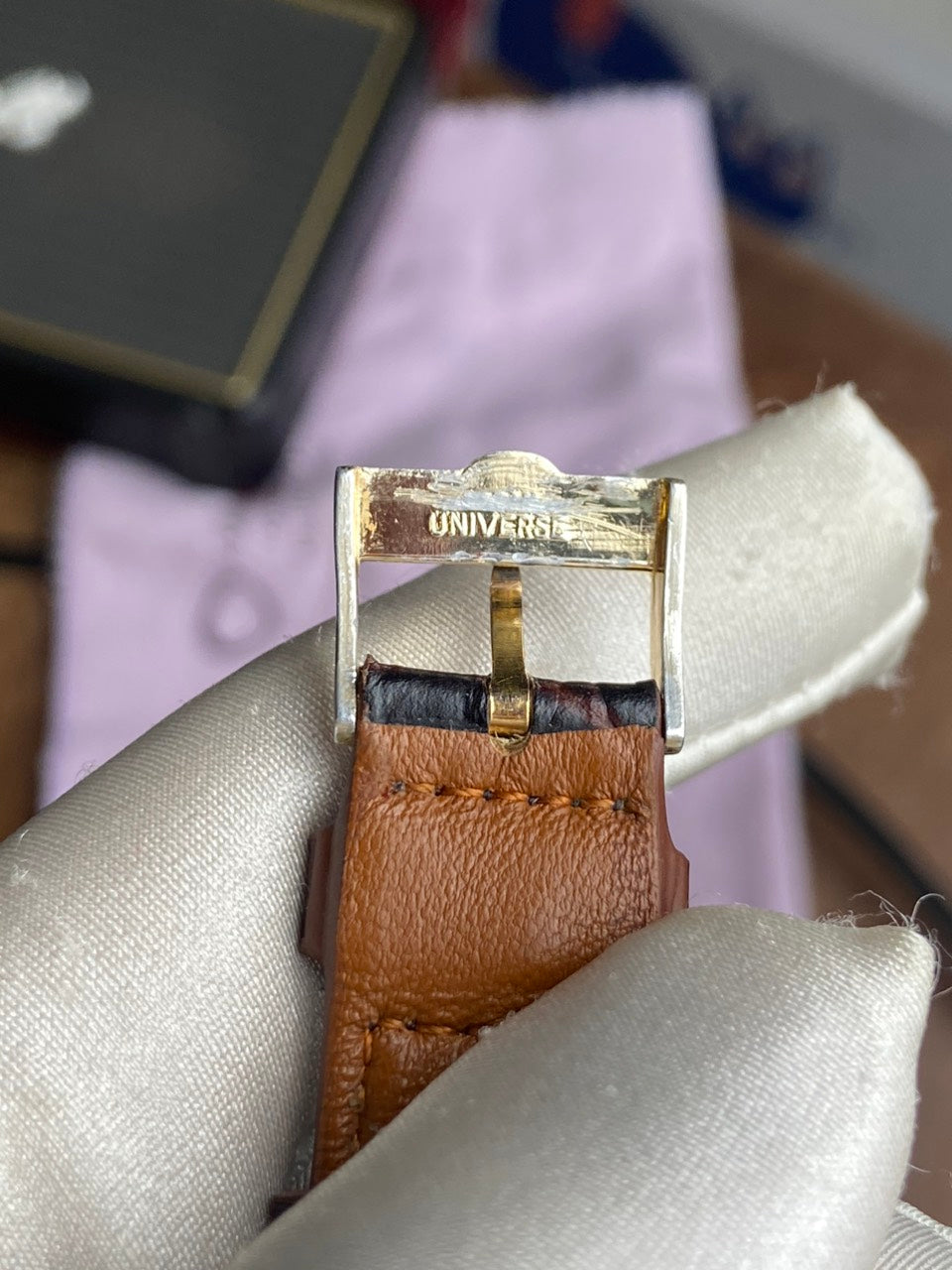 - Aftermarket brown leather strap with original buckle of Universal Geneve.