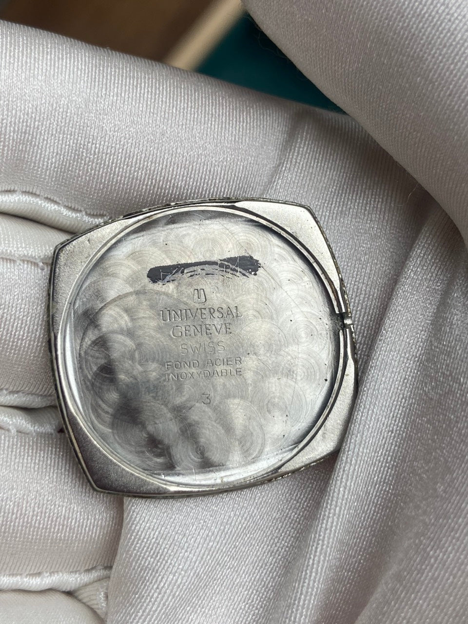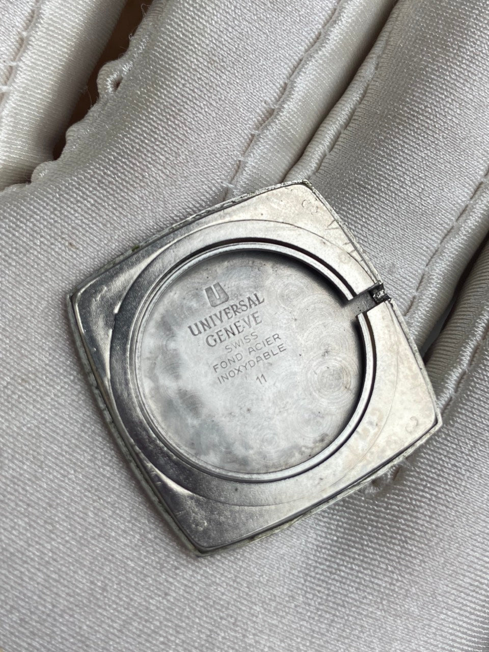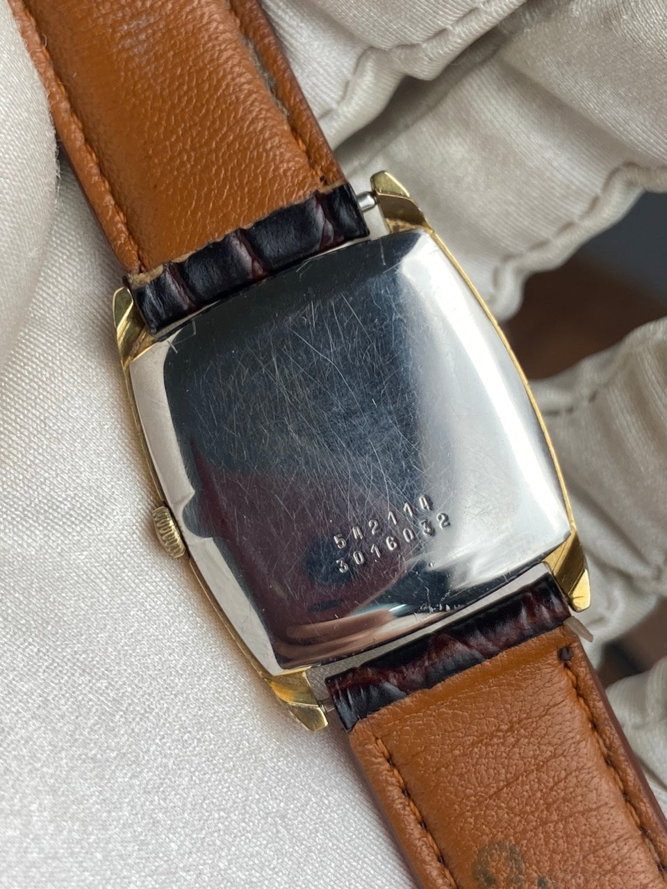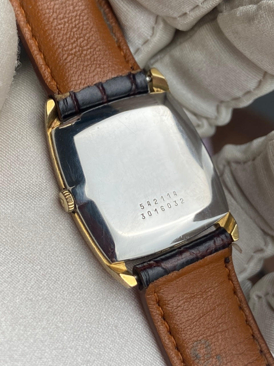 - Aftermarket brown leather strap with original buckle of Universal Geneve.