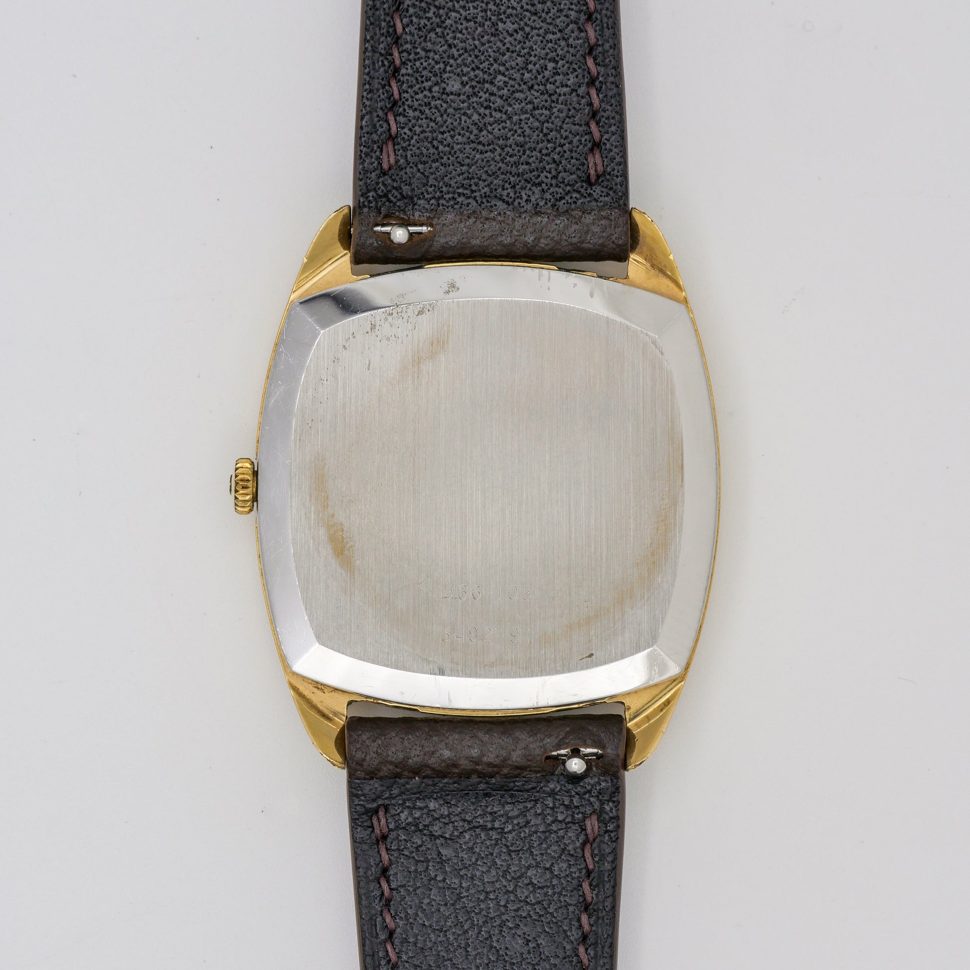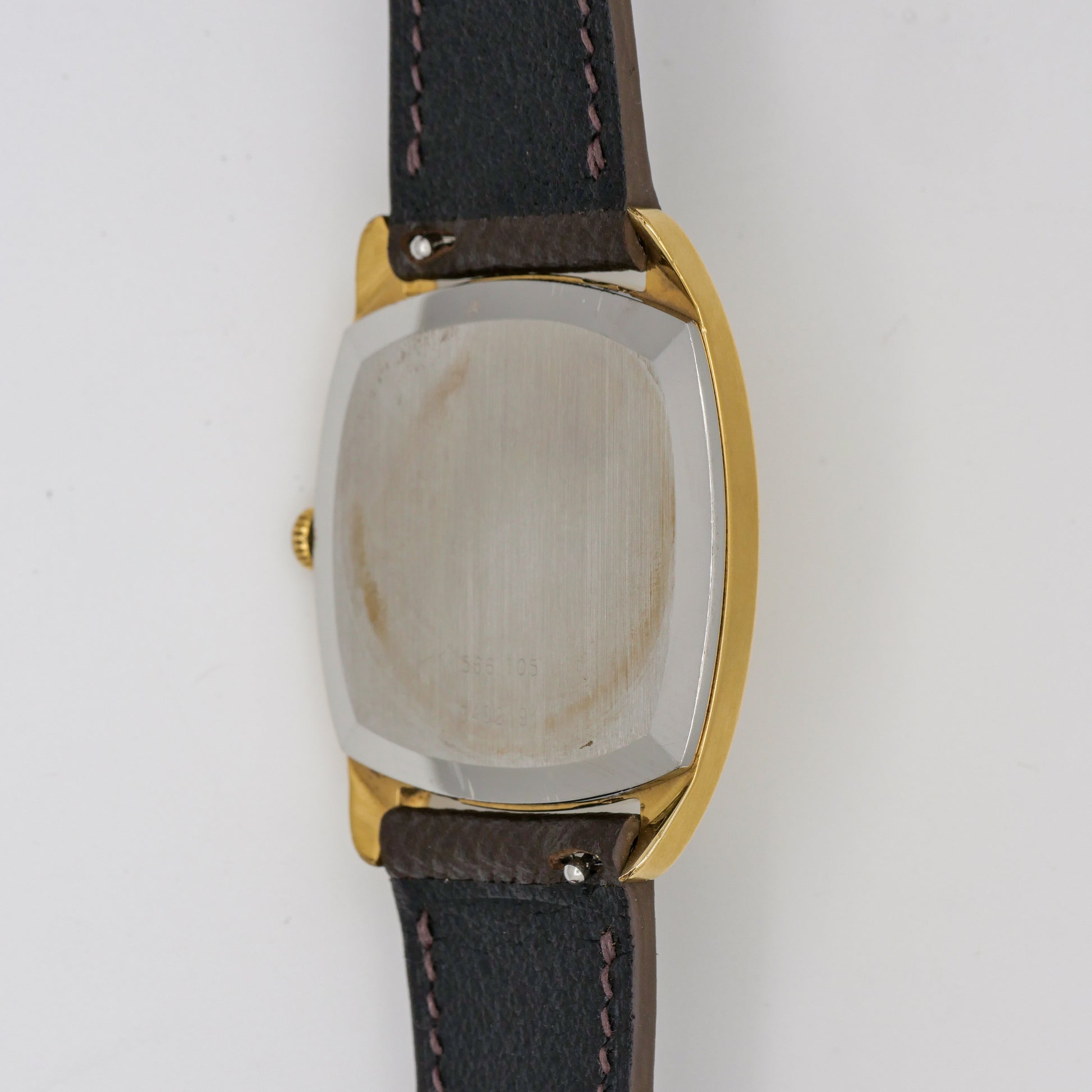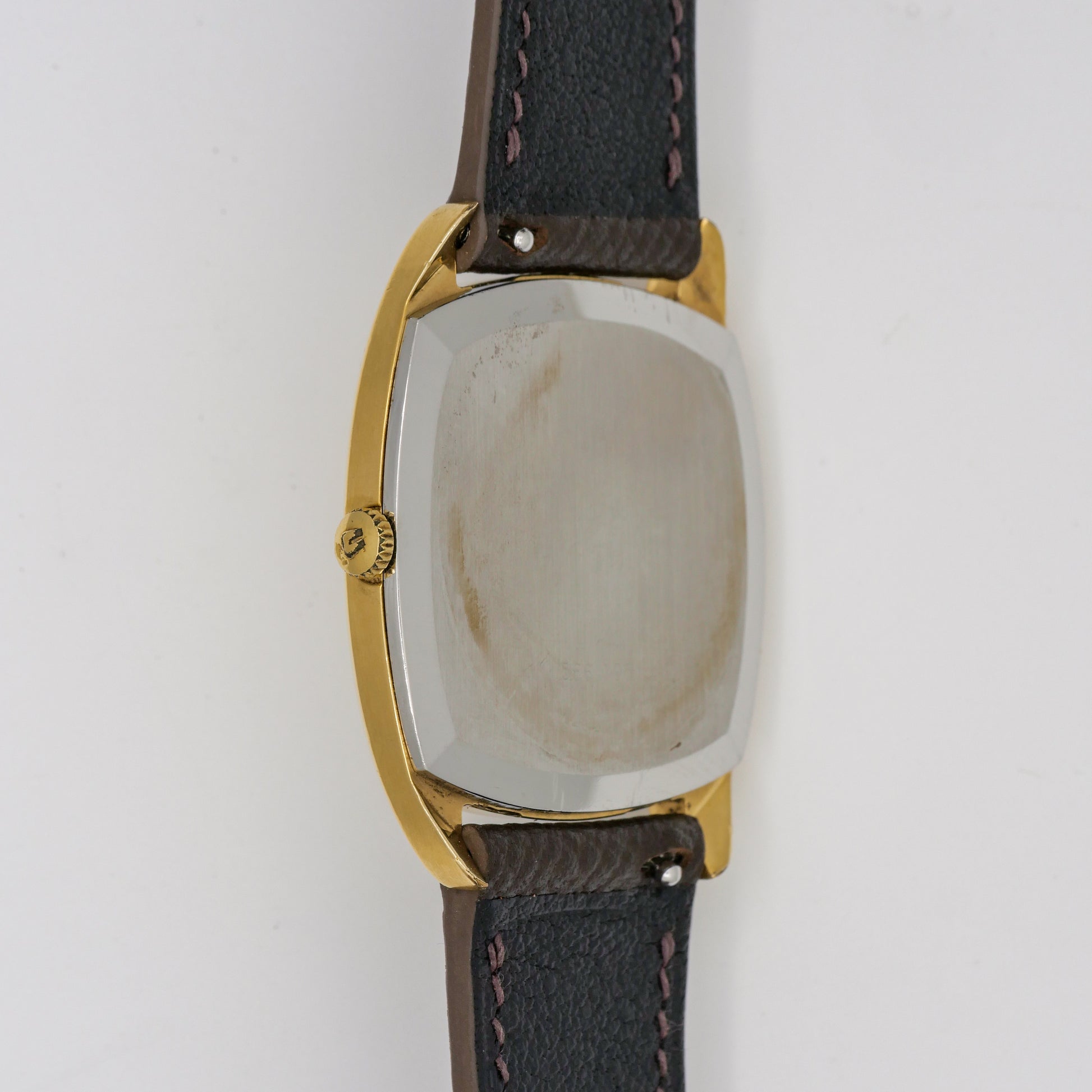 - Case: shows signs of wear, with some visible scratches and minor tarnishing, particularly on the lugs and case edges.