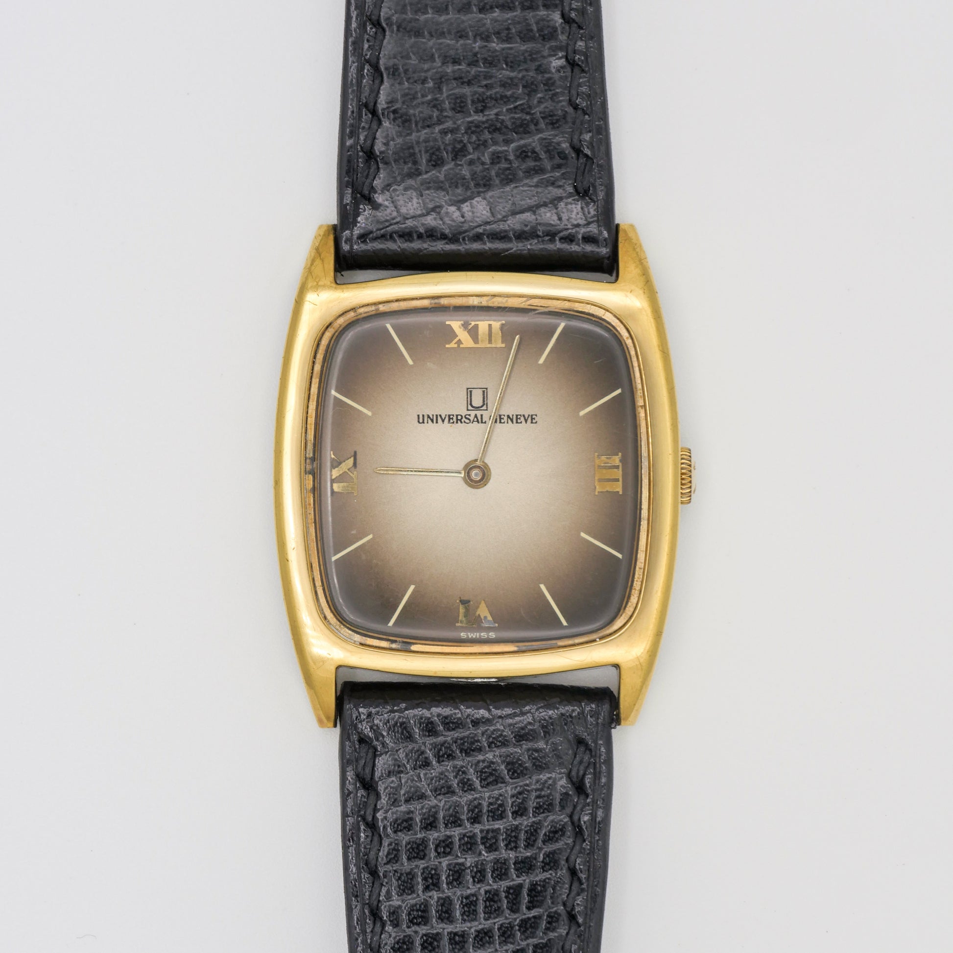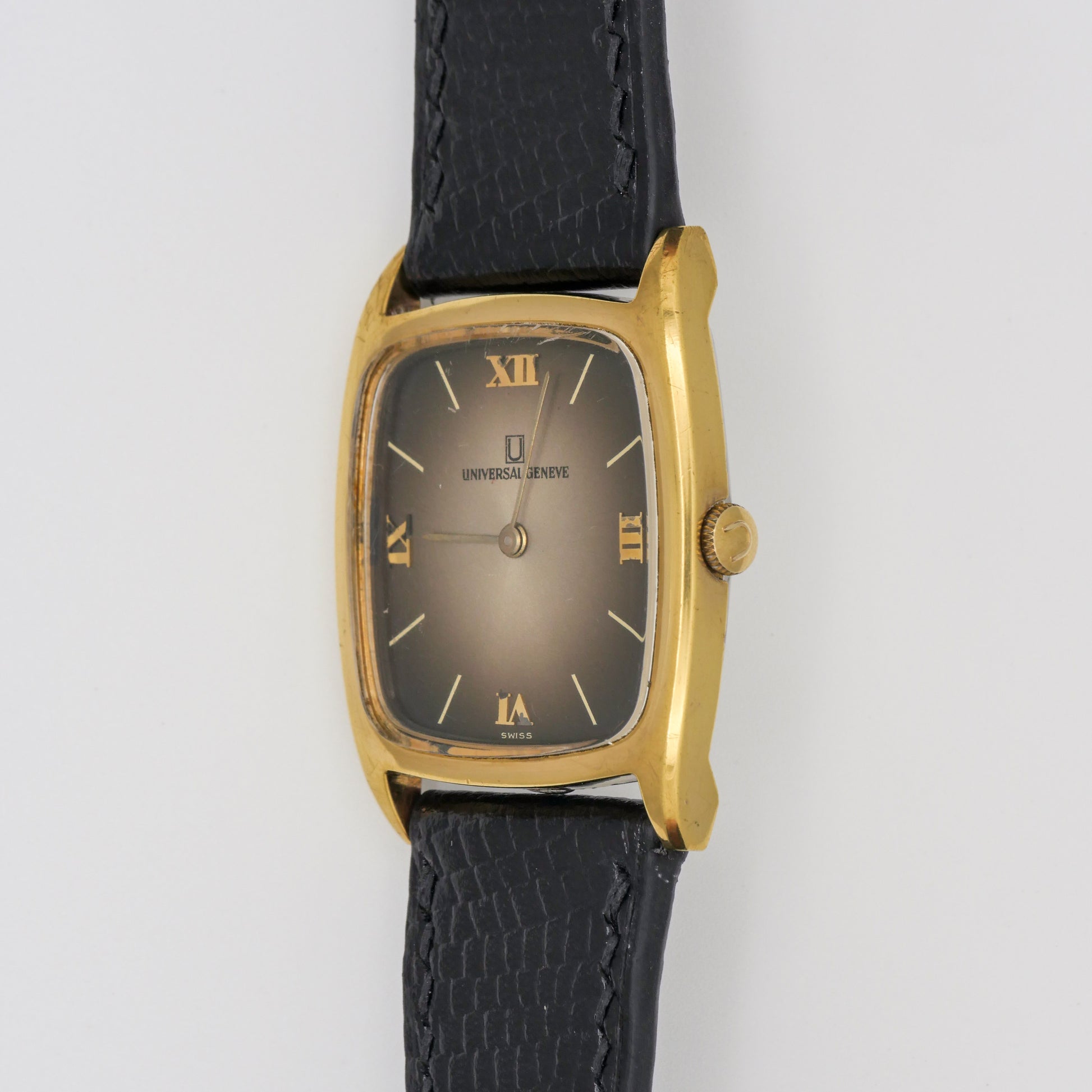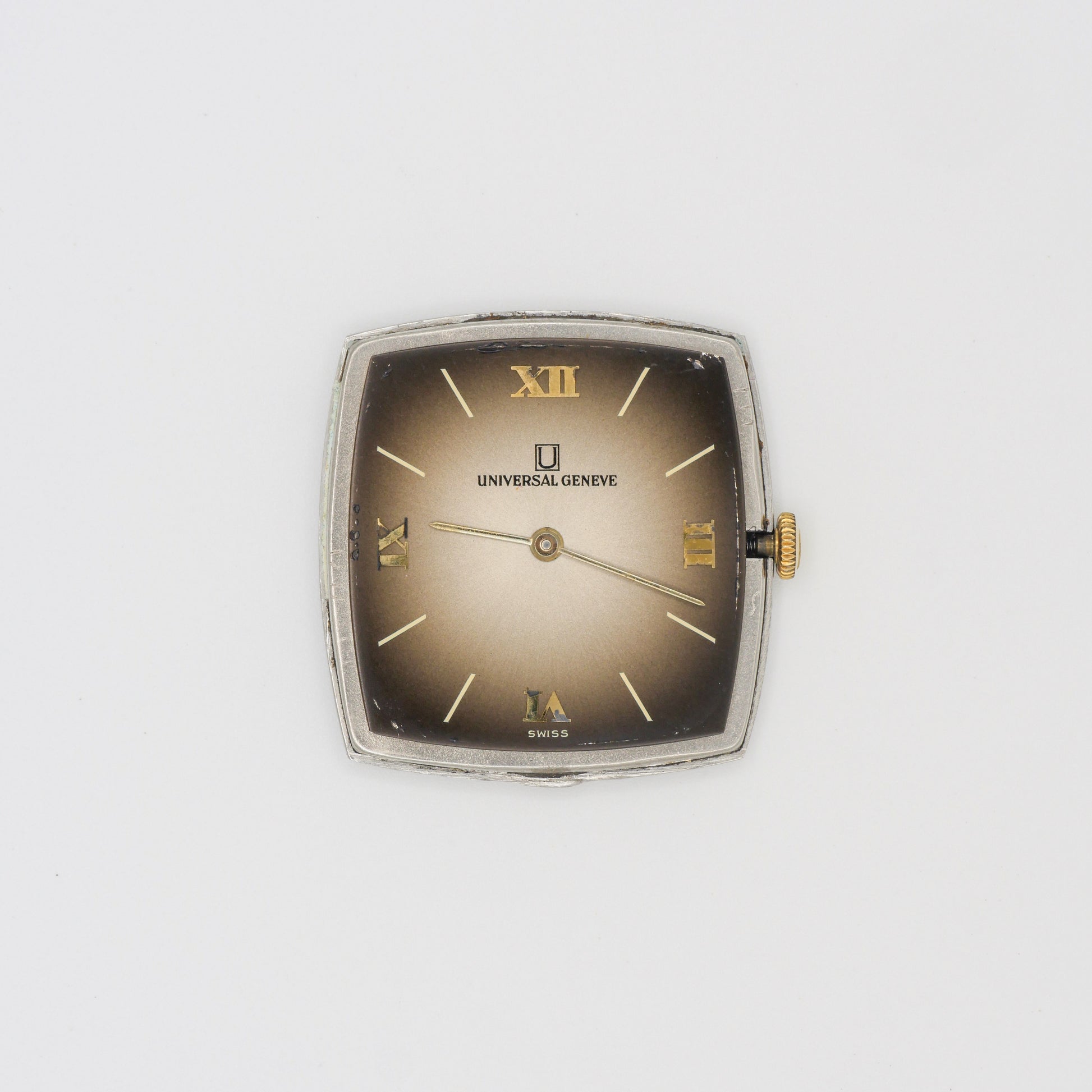 - Dial: The dial shows signs of aging, with a gradient fade from dark brown at the edges to a lighter brown in the center. The Roman numeral hour markers show slight oxidation.