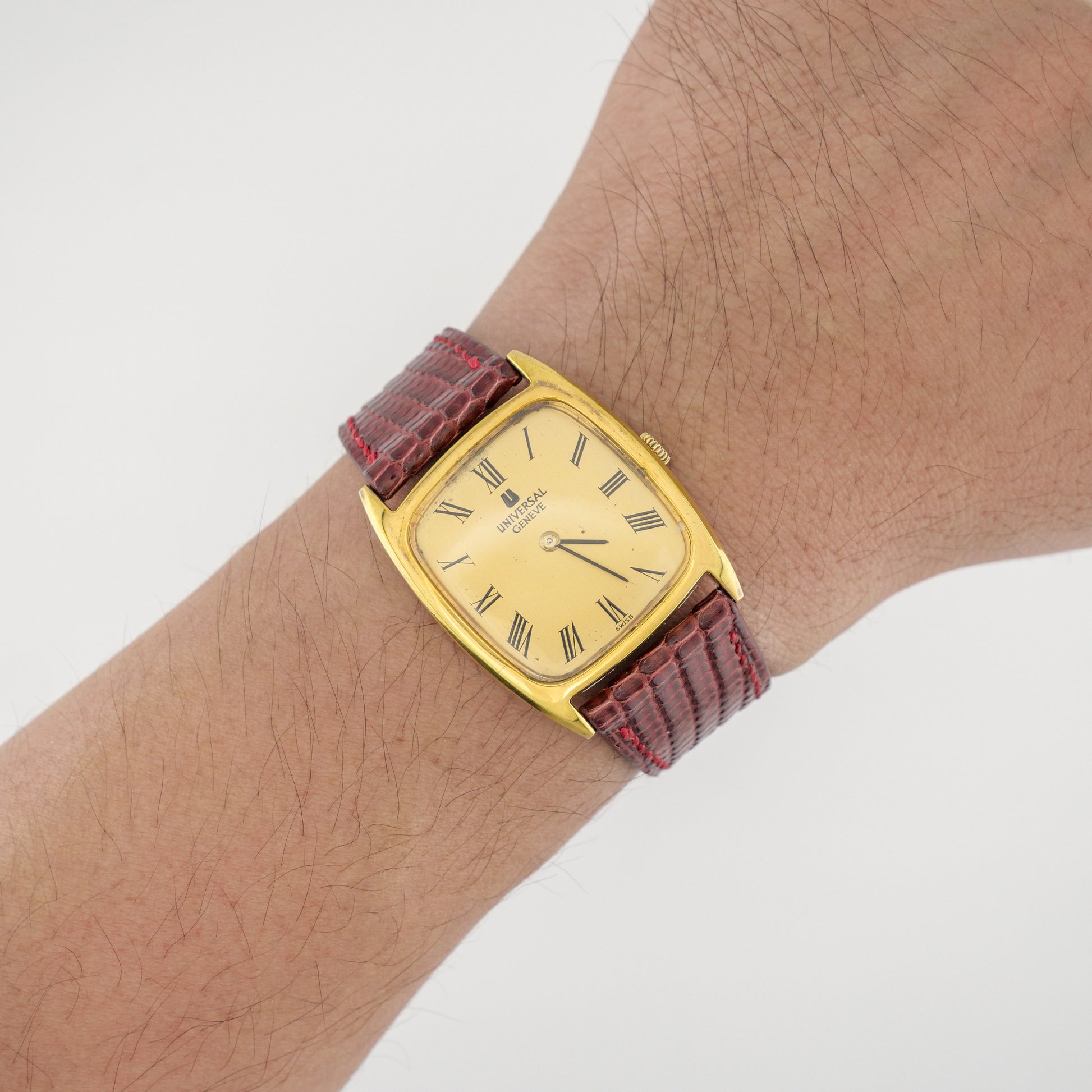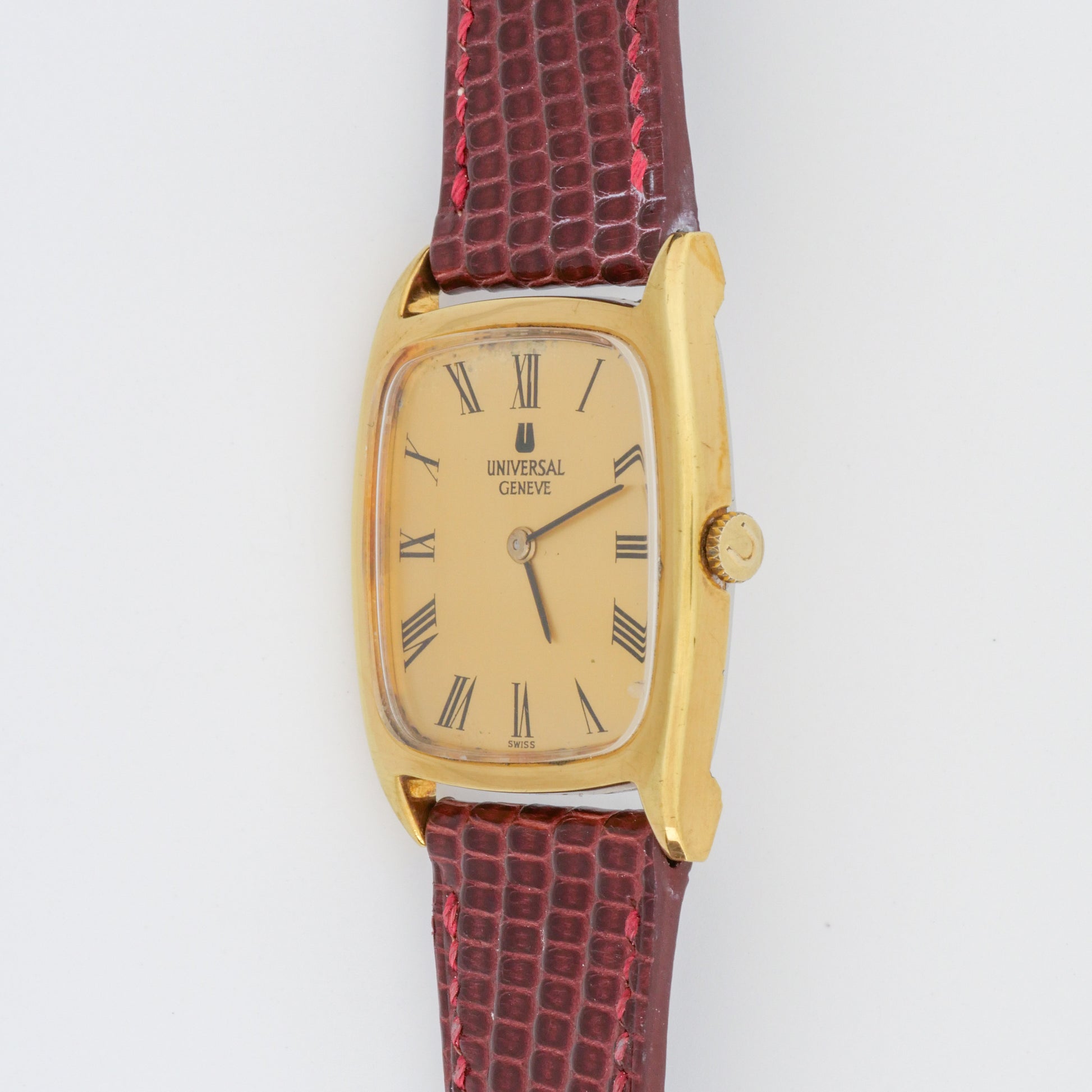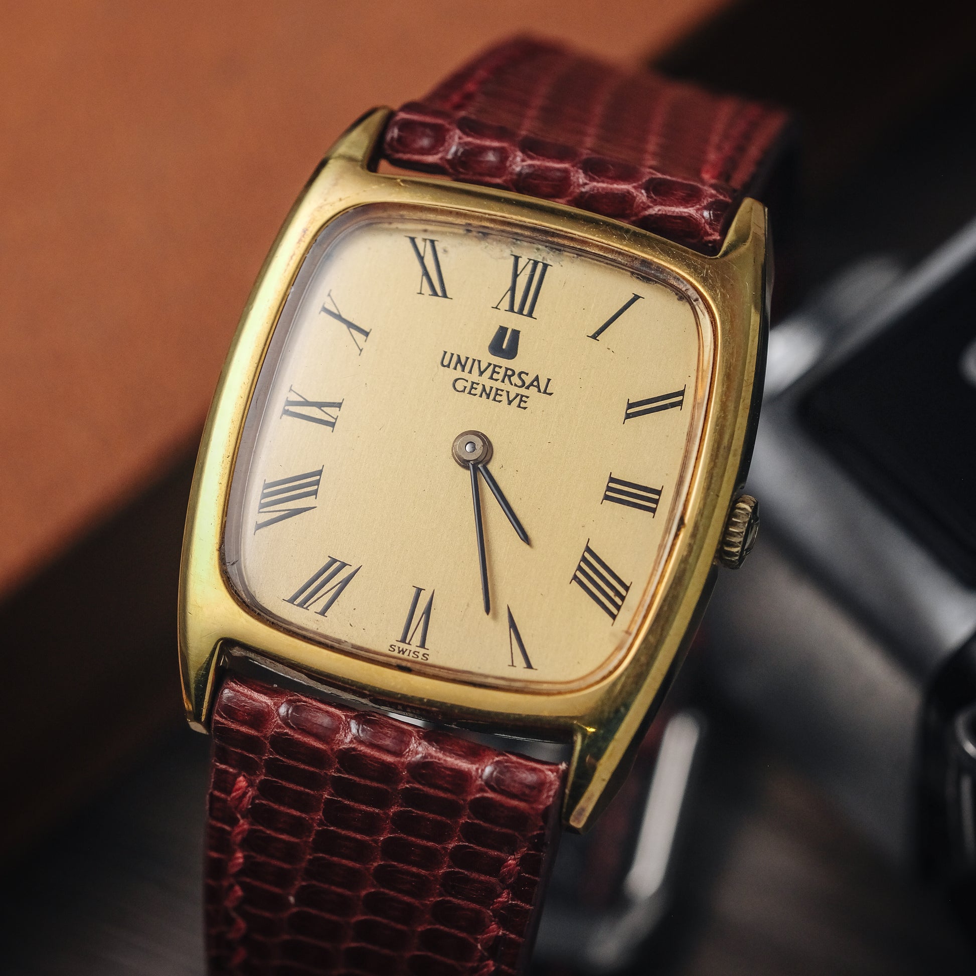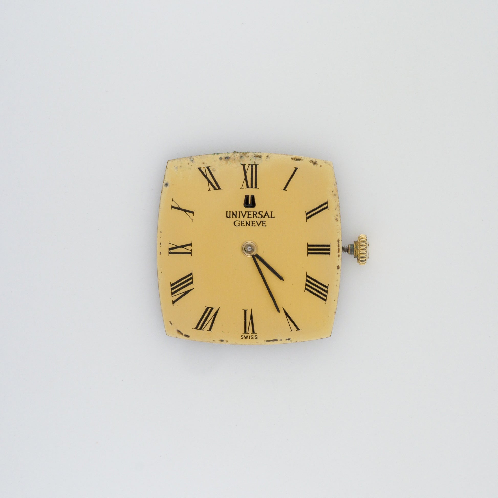 - Dial: in good vintage condition, maintaining its original finish with Roman numeral markers. There are minimal aging and spotting, and the text "UNIVERSAL GENEVE" remains clear and legible.