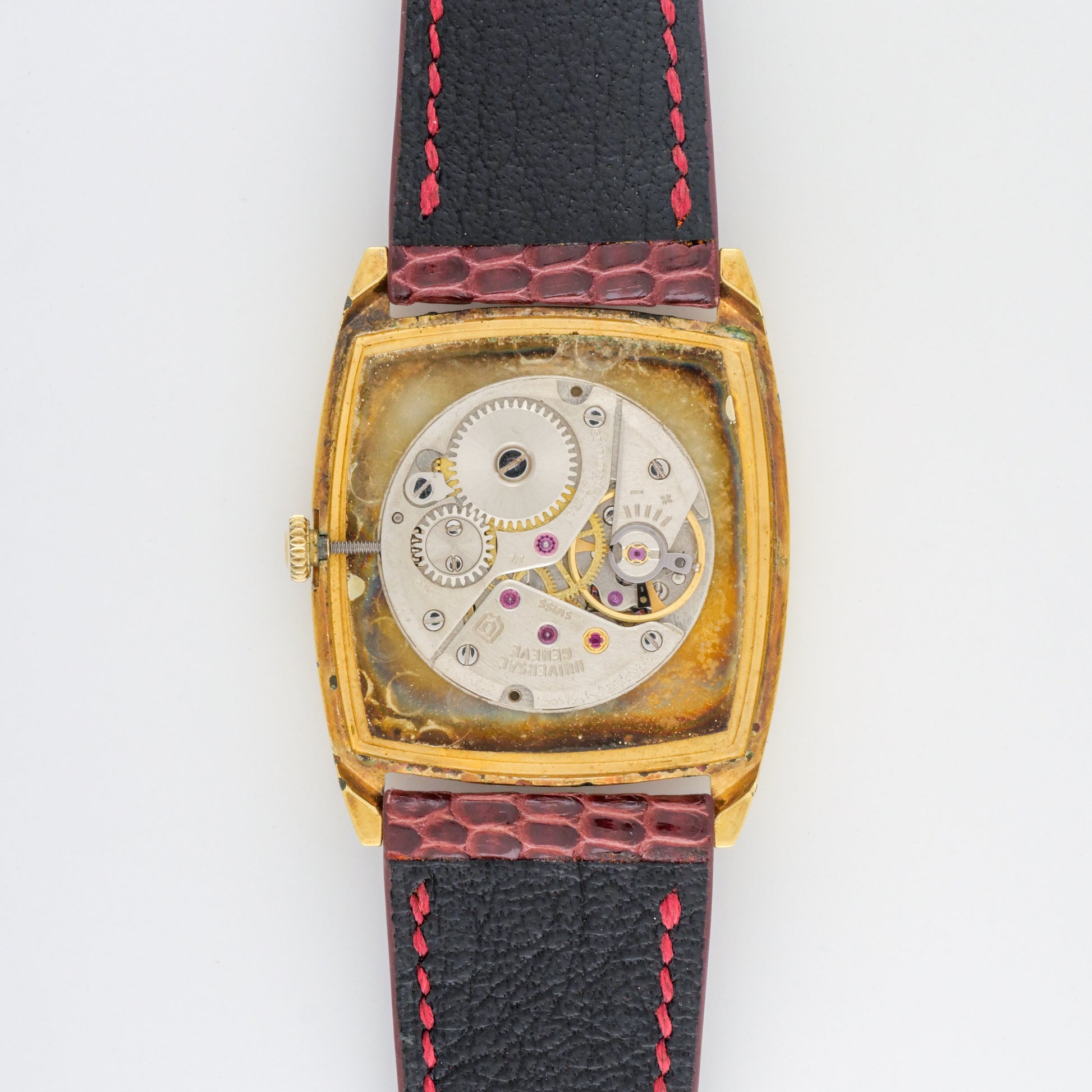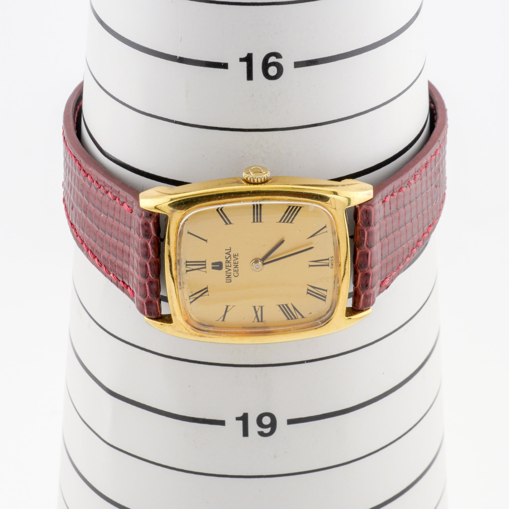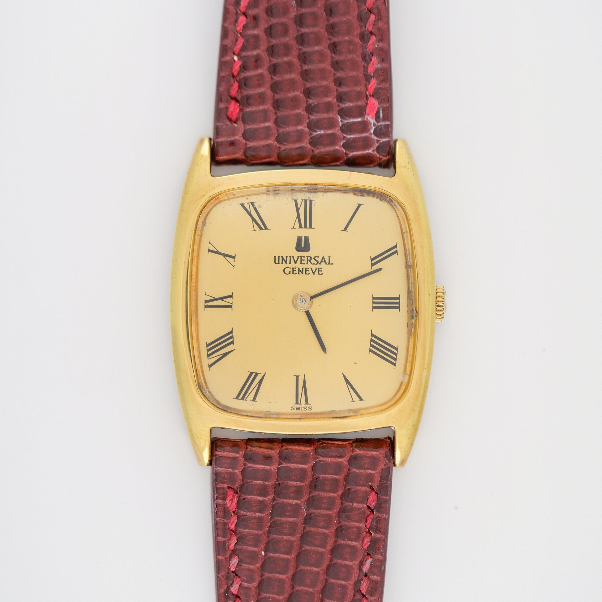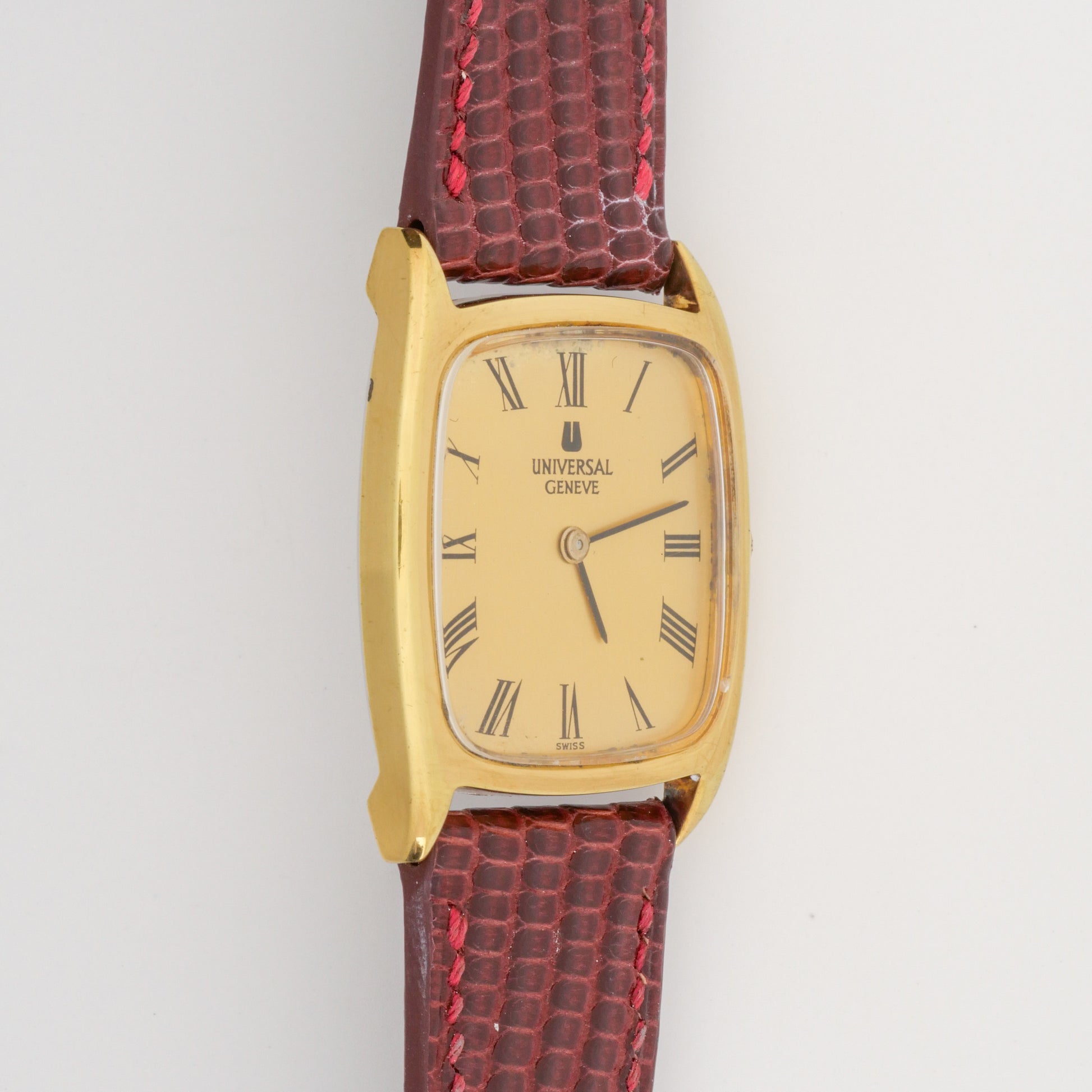 - Dial: in good vintage condition, maintaining its original finish with Roman numeral markers. There are minimal aging and spotting, and the text "UNIVERSAL GENEVE" remains clear and legible.
