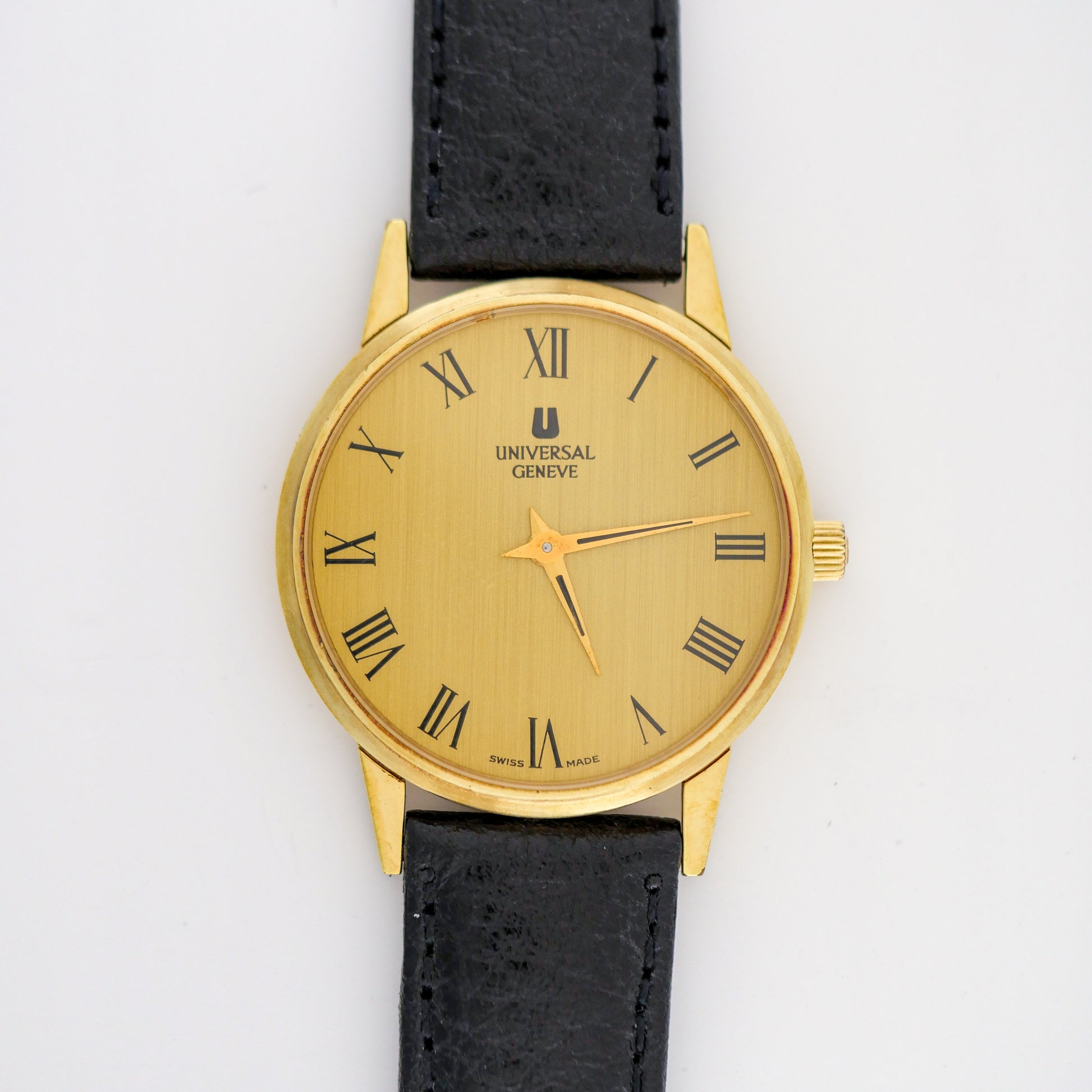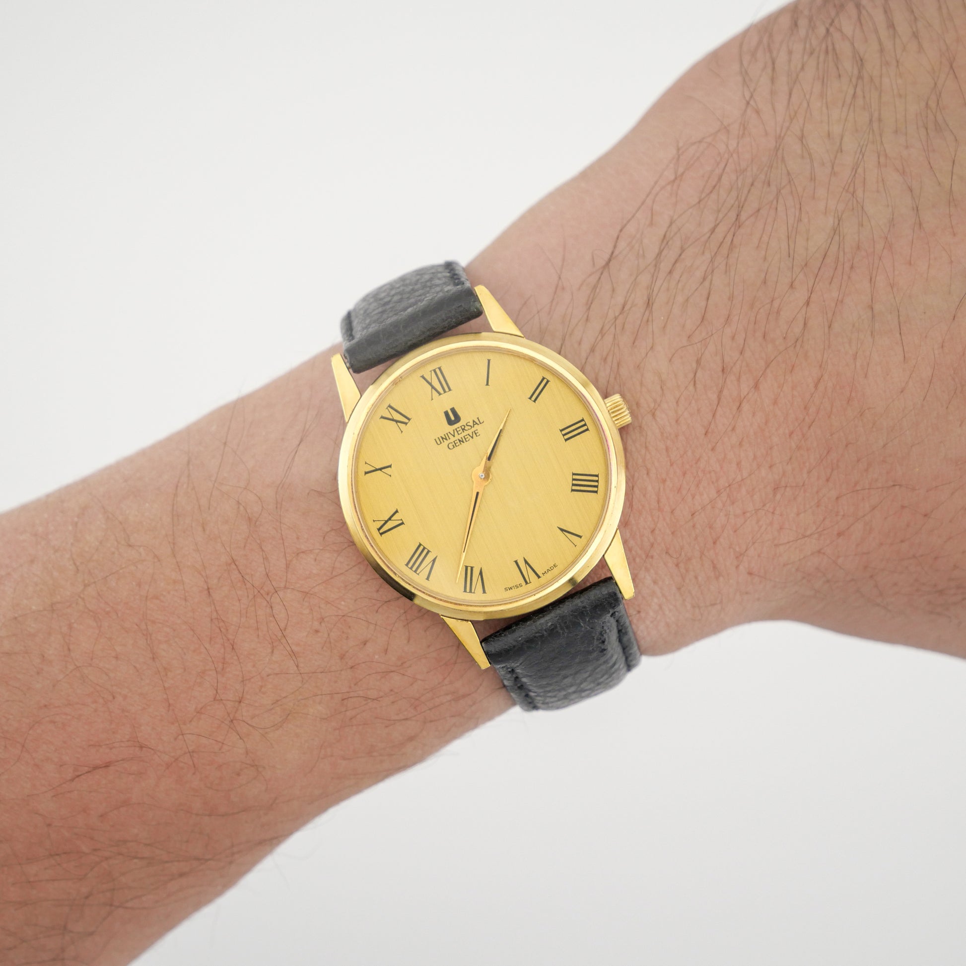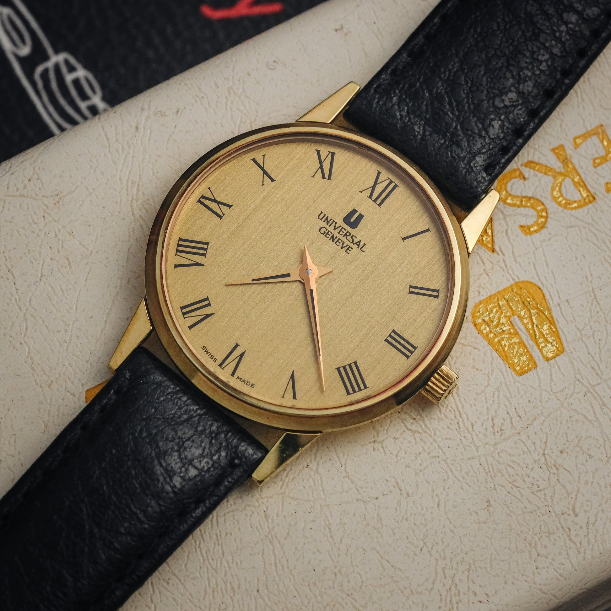 - Dial: is in excellent condition, showing minimal aging or deterioration. The Roman numeral markers and Universal Genève logo remain crisp and well-defined. The dial surface maintains its original brushed finish with no apparent discoloration or spotting.