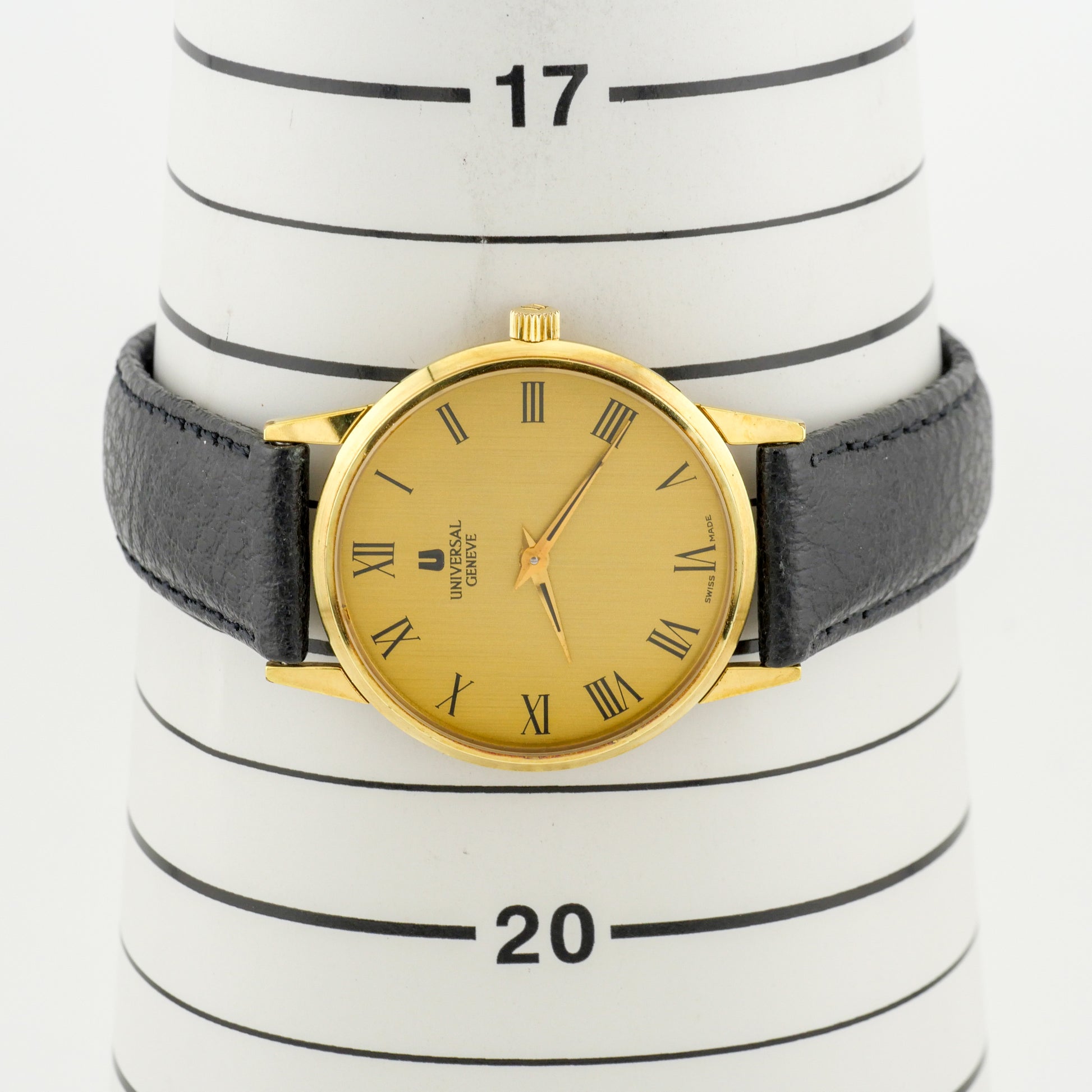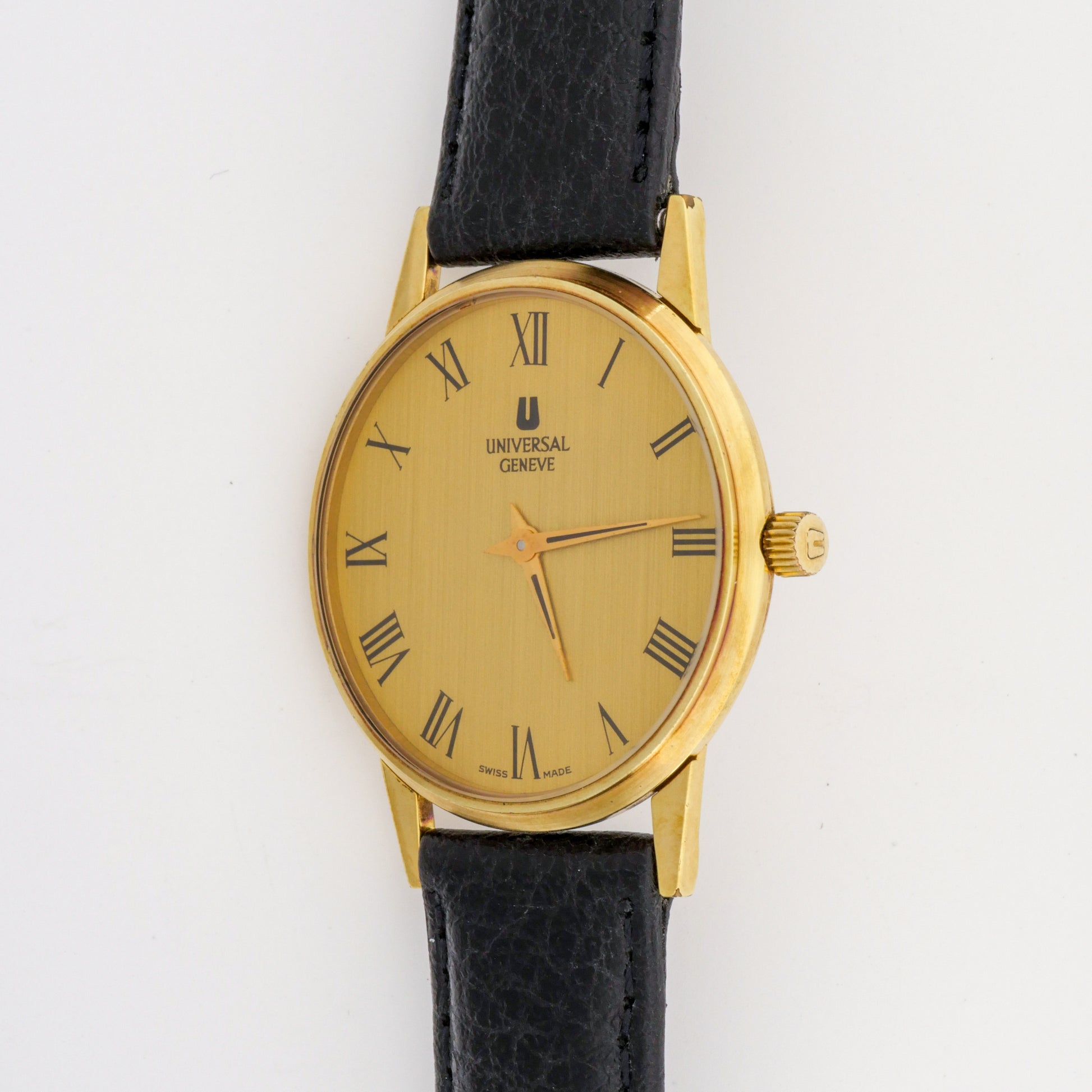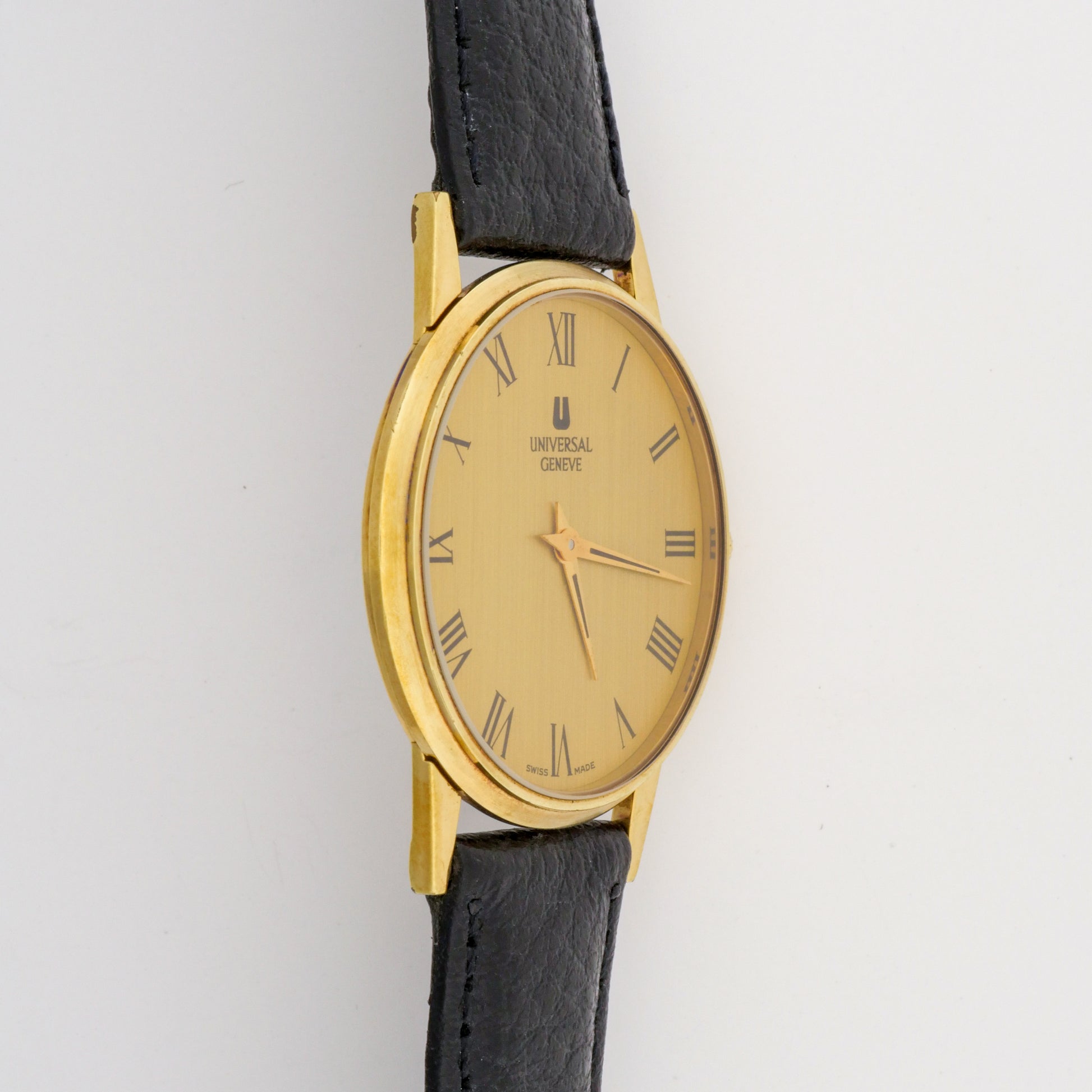 - Dial: is in excellent condition, showing minimal aging or deterioration. The Roman numeral markers and Universal Genève logo remain crisp and well-defined. The dial surface maintains its original brushed finish with no apparent discoloration or spotting.
