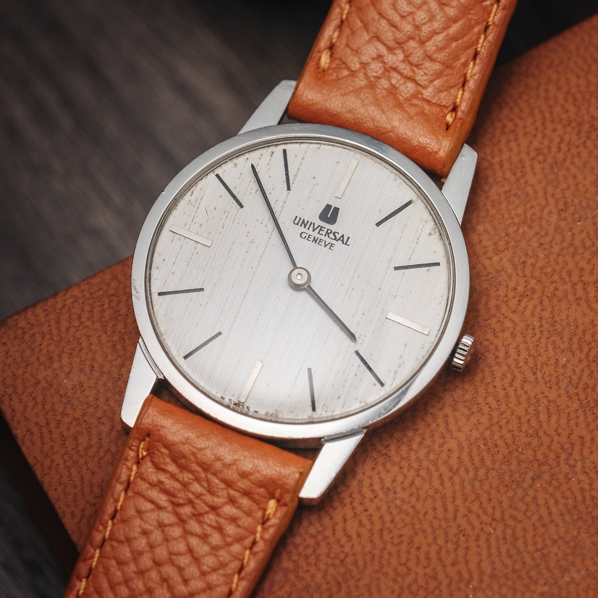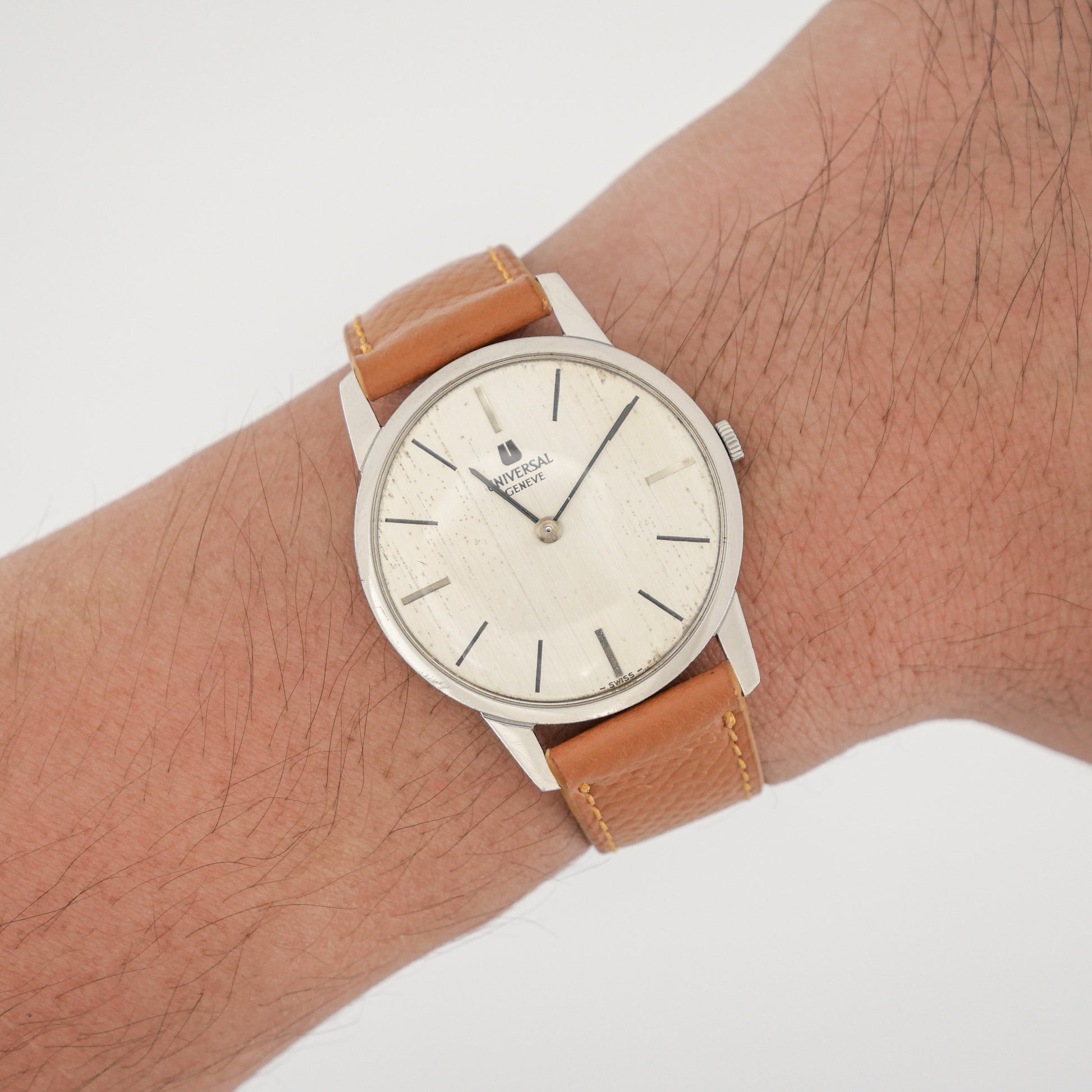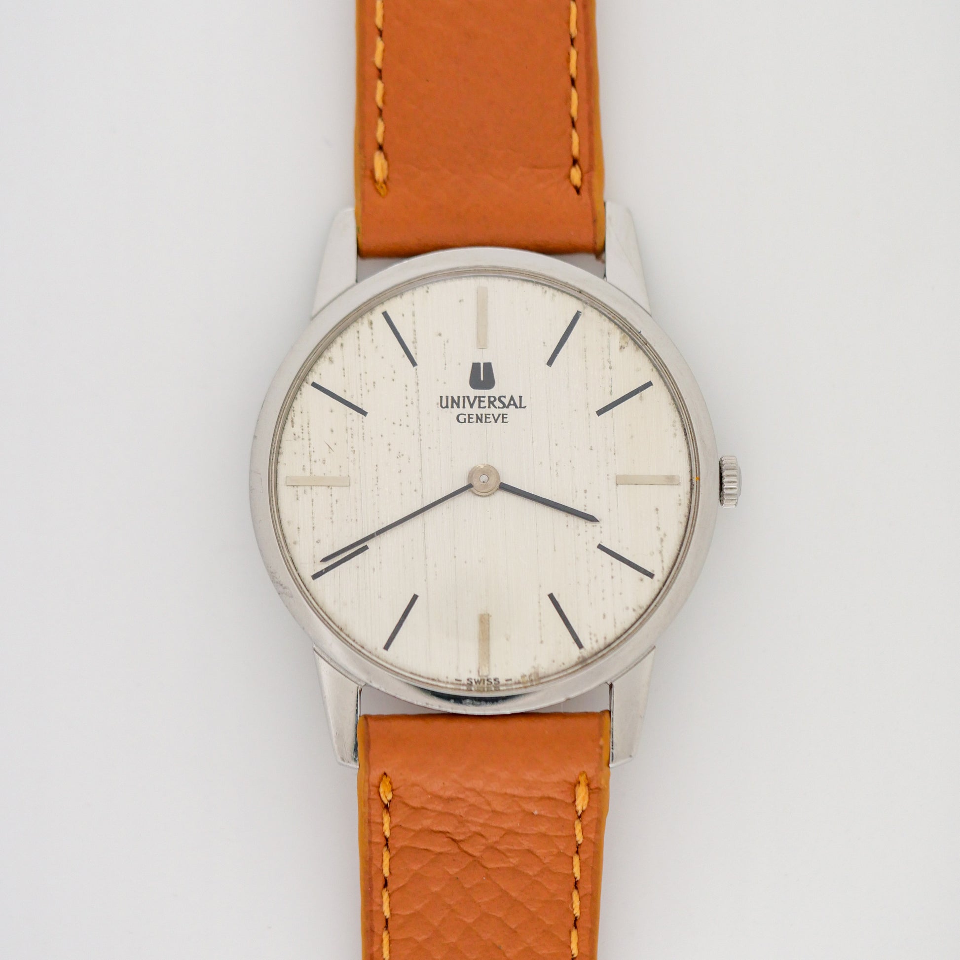 - Dial: displays some aging with visible spotting and light oxidation throughout the surface, giving it a textured appearance. The hour markers and Universal Genève logo remain clear and legible.