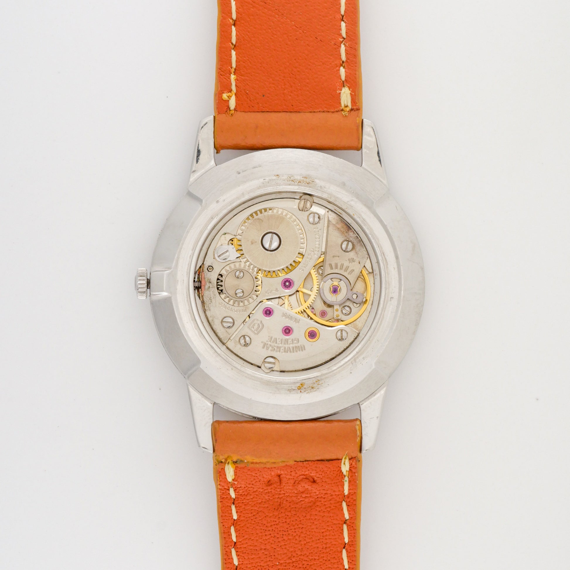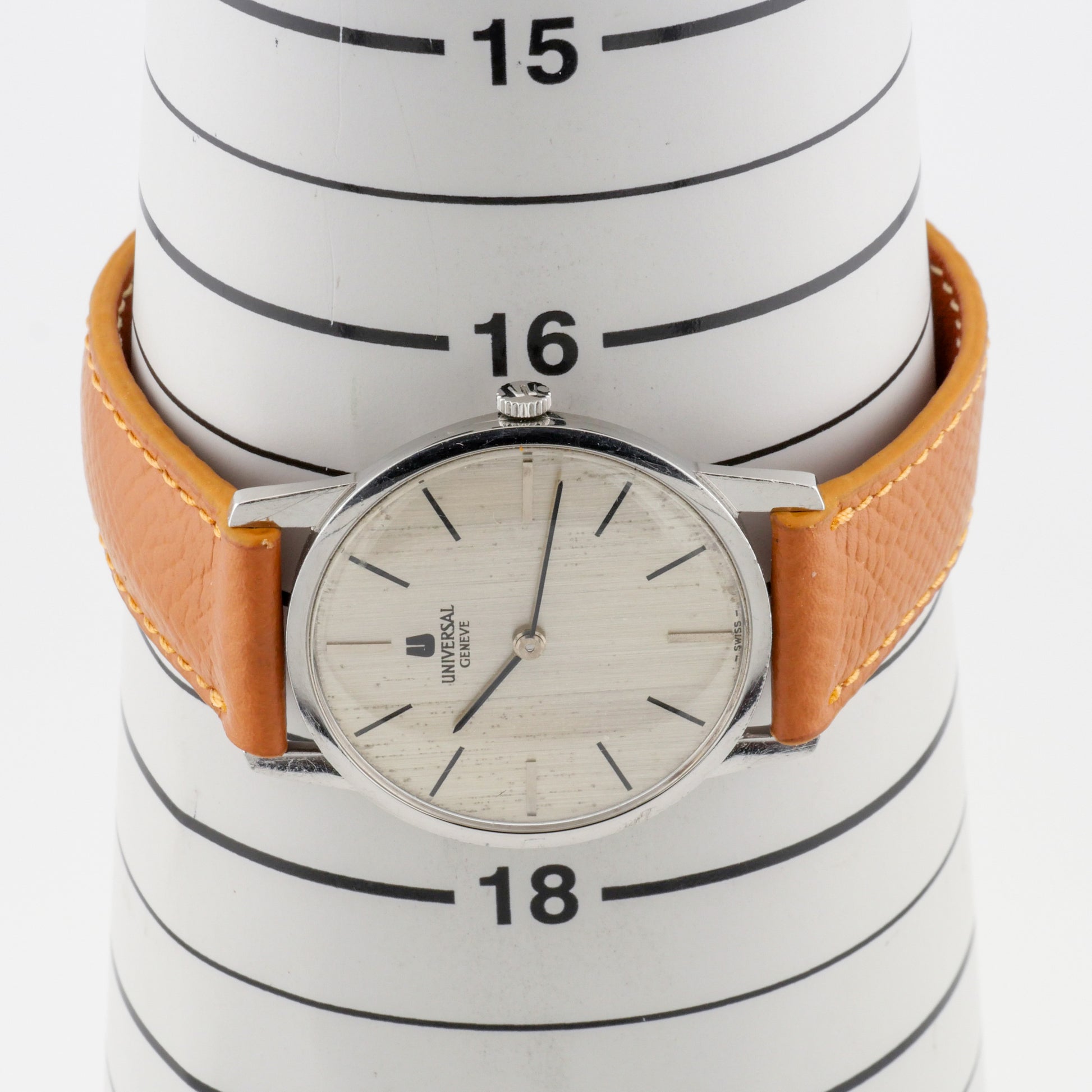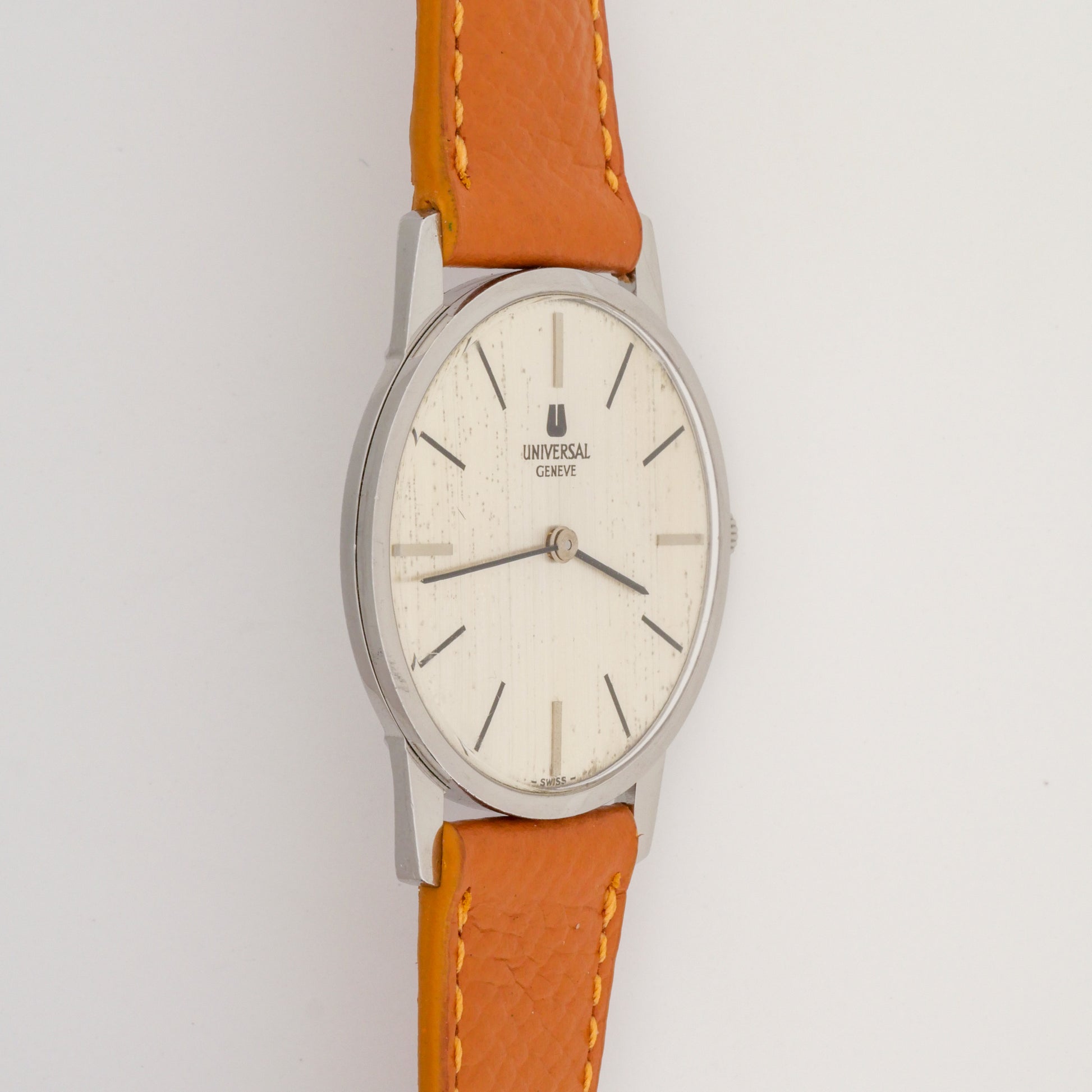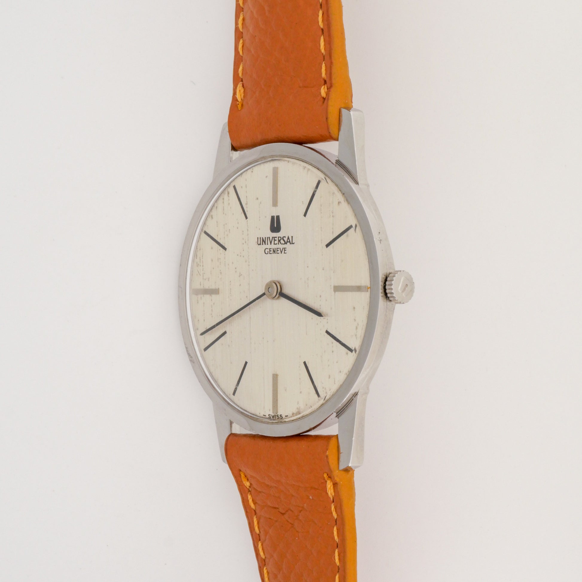 - Dial: displays some aging with visible spotting and light oxidation throughout the surface, giving it a textured appearance. The hour markers and Universal Genève logo remain clear and legible.