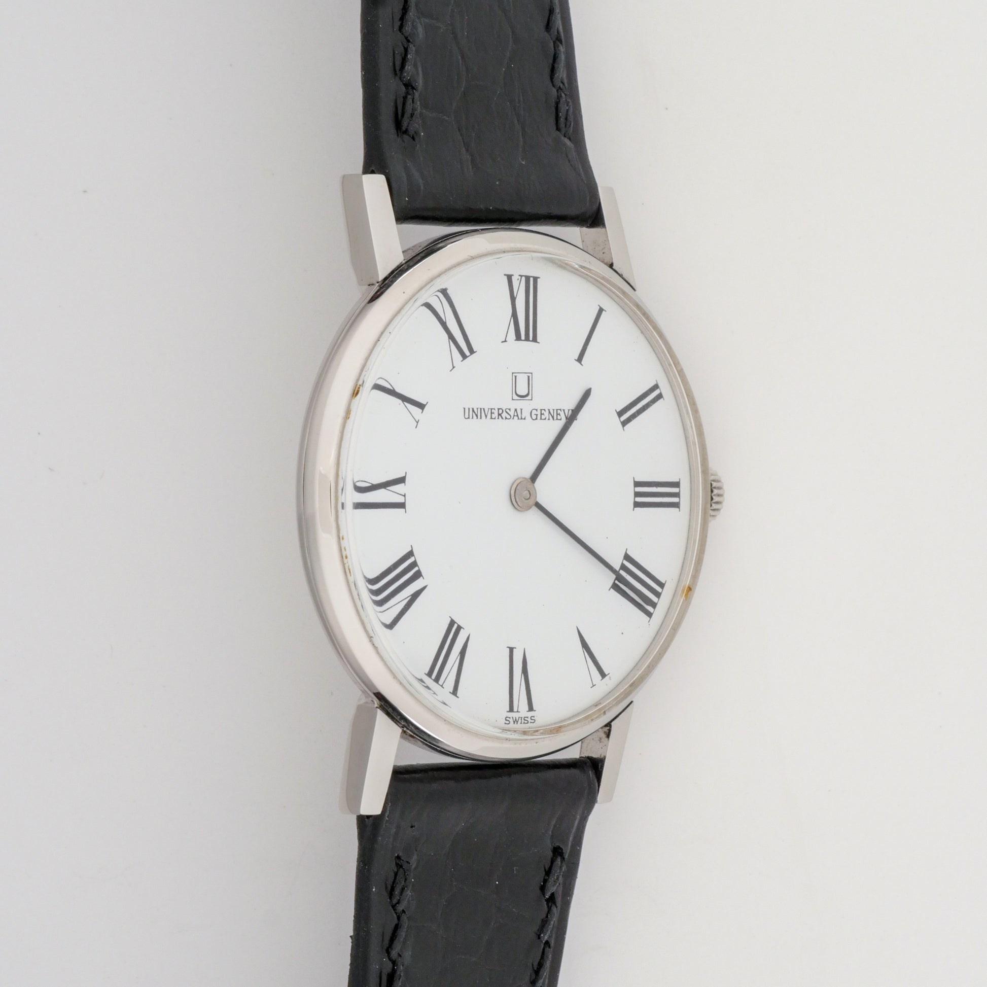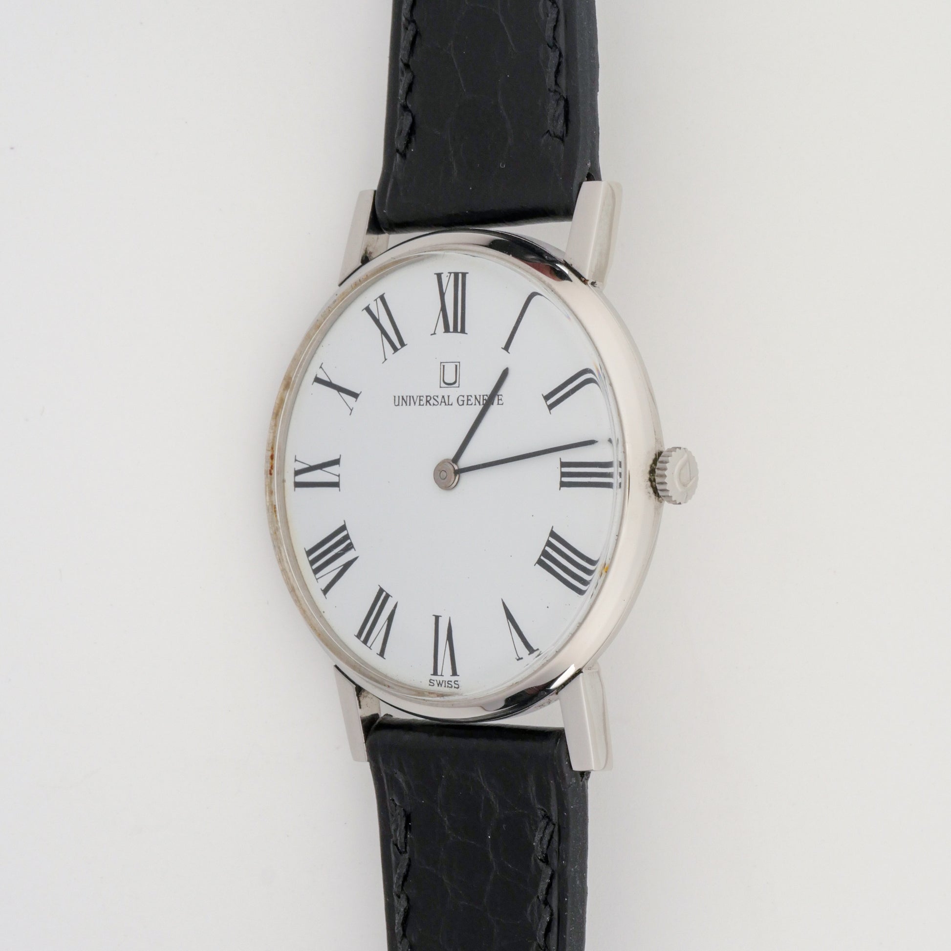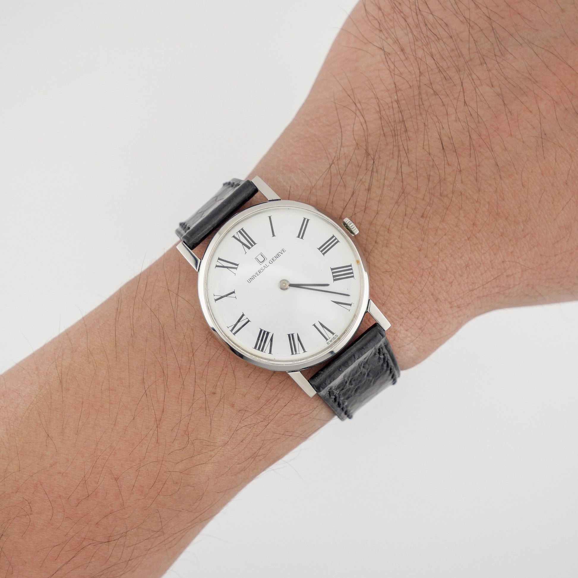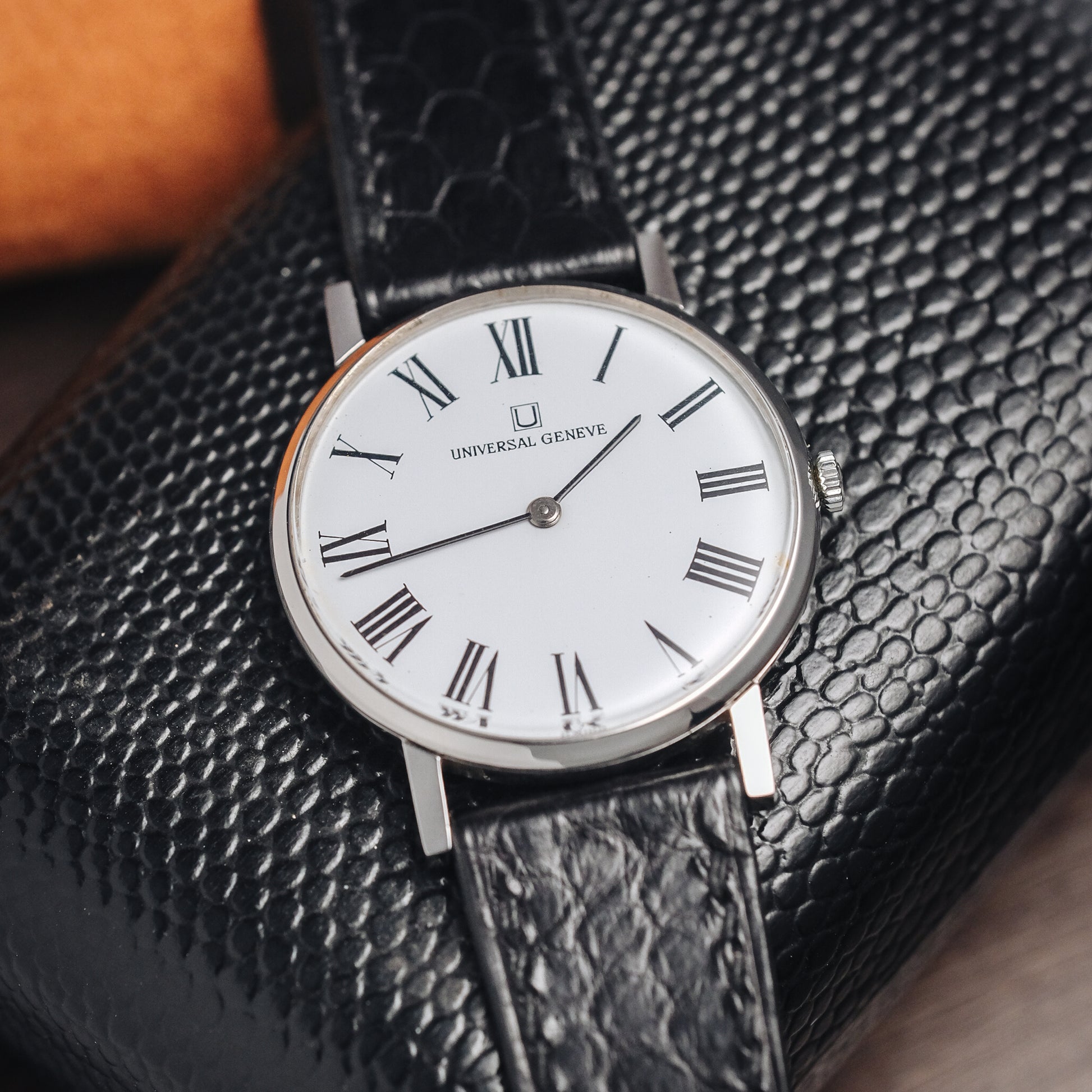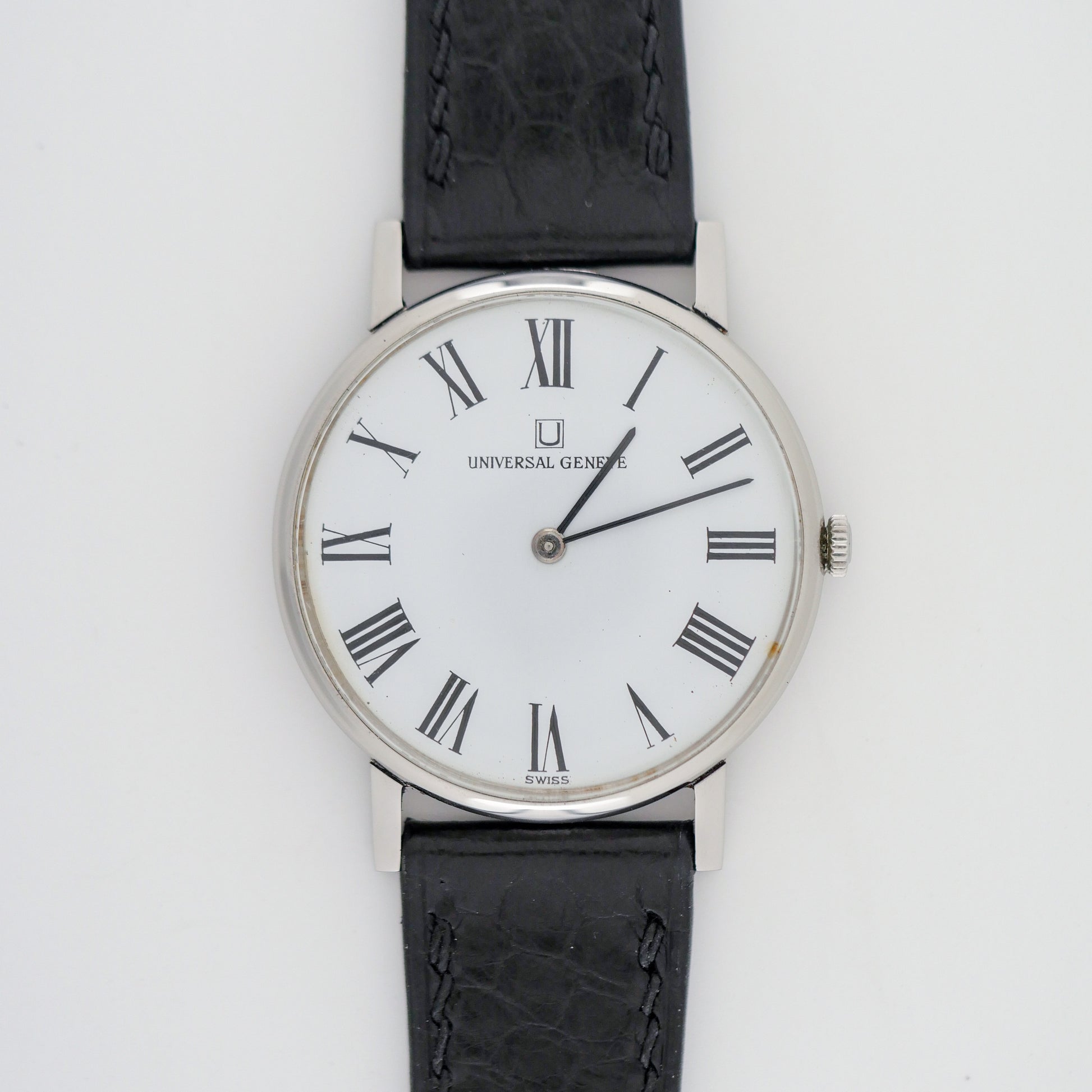 - Dial: is in very good condition, showing minimal aging or patina. The Roman numerals remain sharp and clearly legible, and the Universal Genève logo appears clean and well-preserved. There are no apparent water spots, discoloration, or damage to the dial surface.