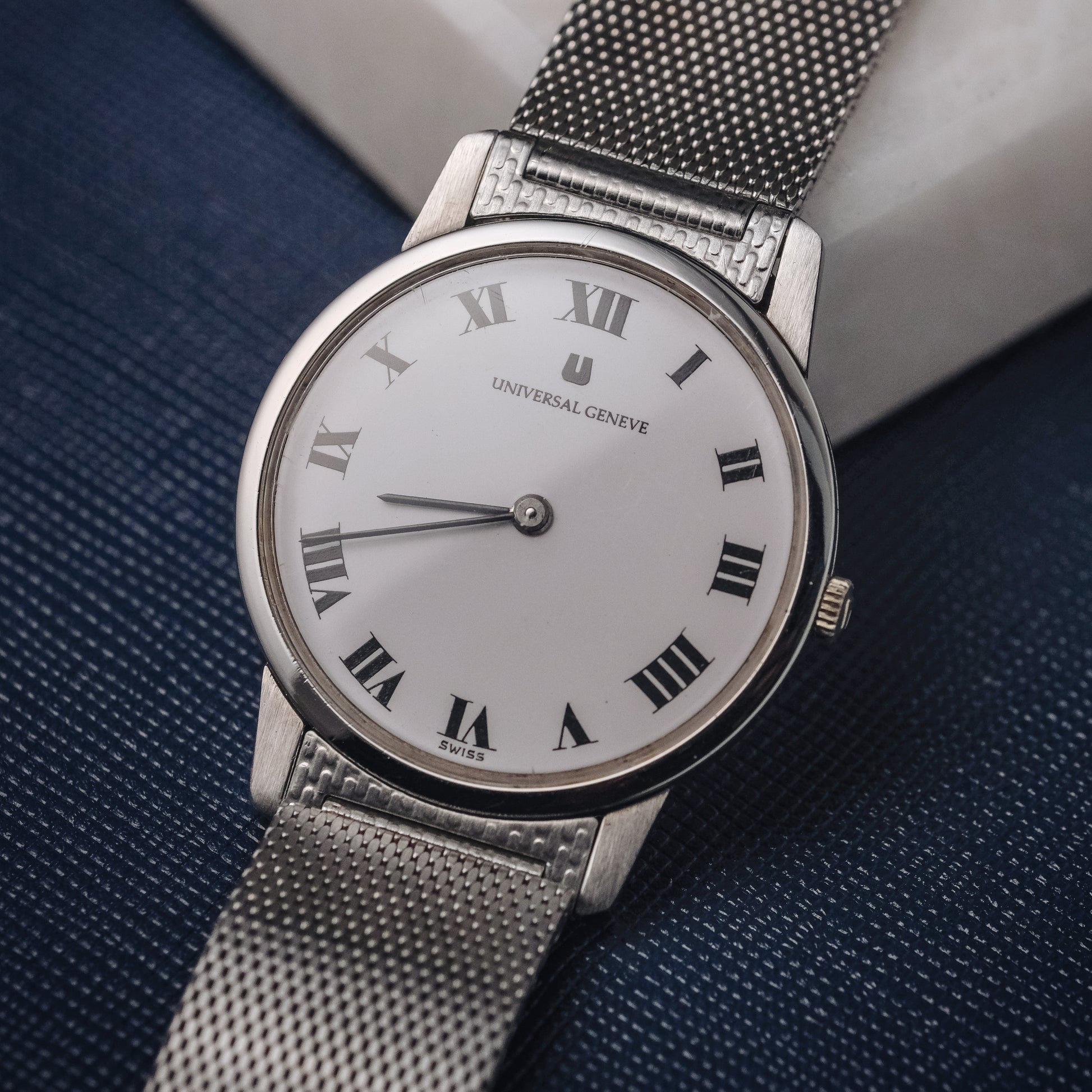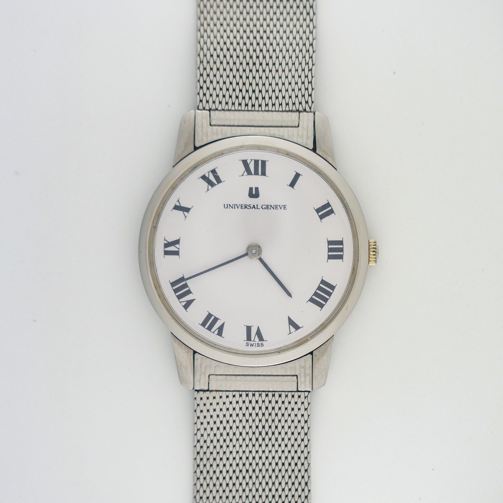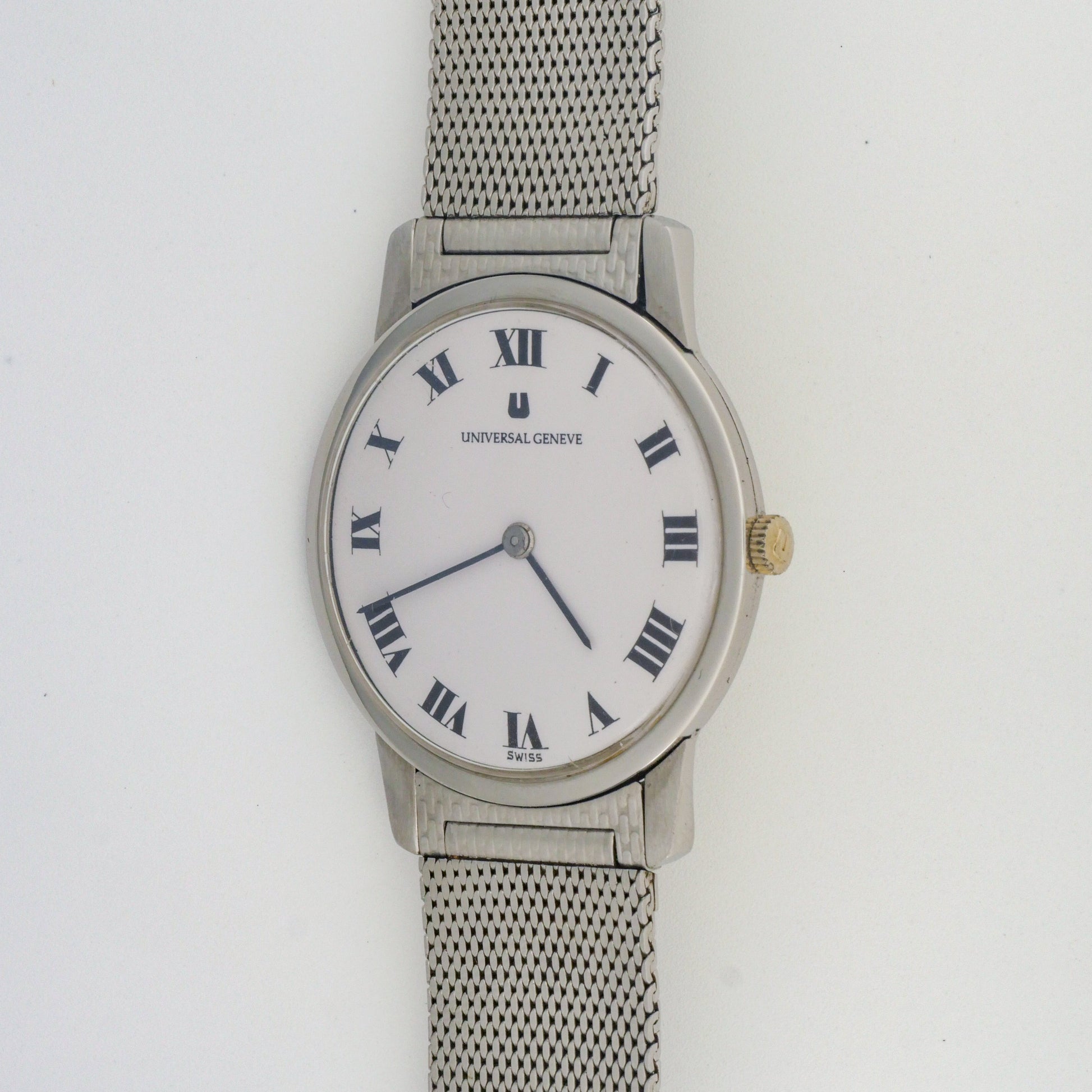 - Dial: is in good condition with minimal aging. There is a few very small marks or dust particles visible under close inspection, but no major spotting, discoloration, or damage. The Roman numerals and Universal Genève text remain crisp and well-defined with no fading.