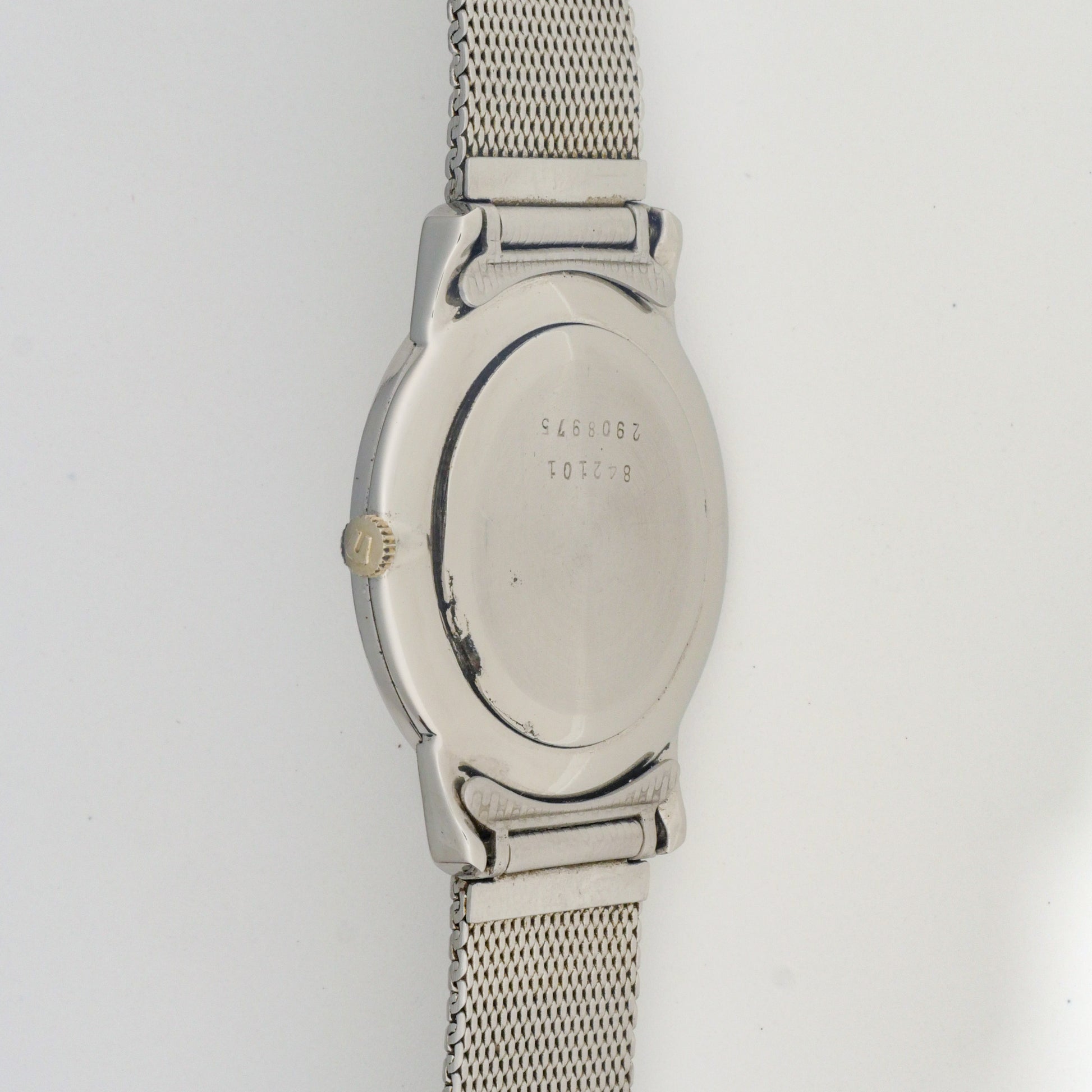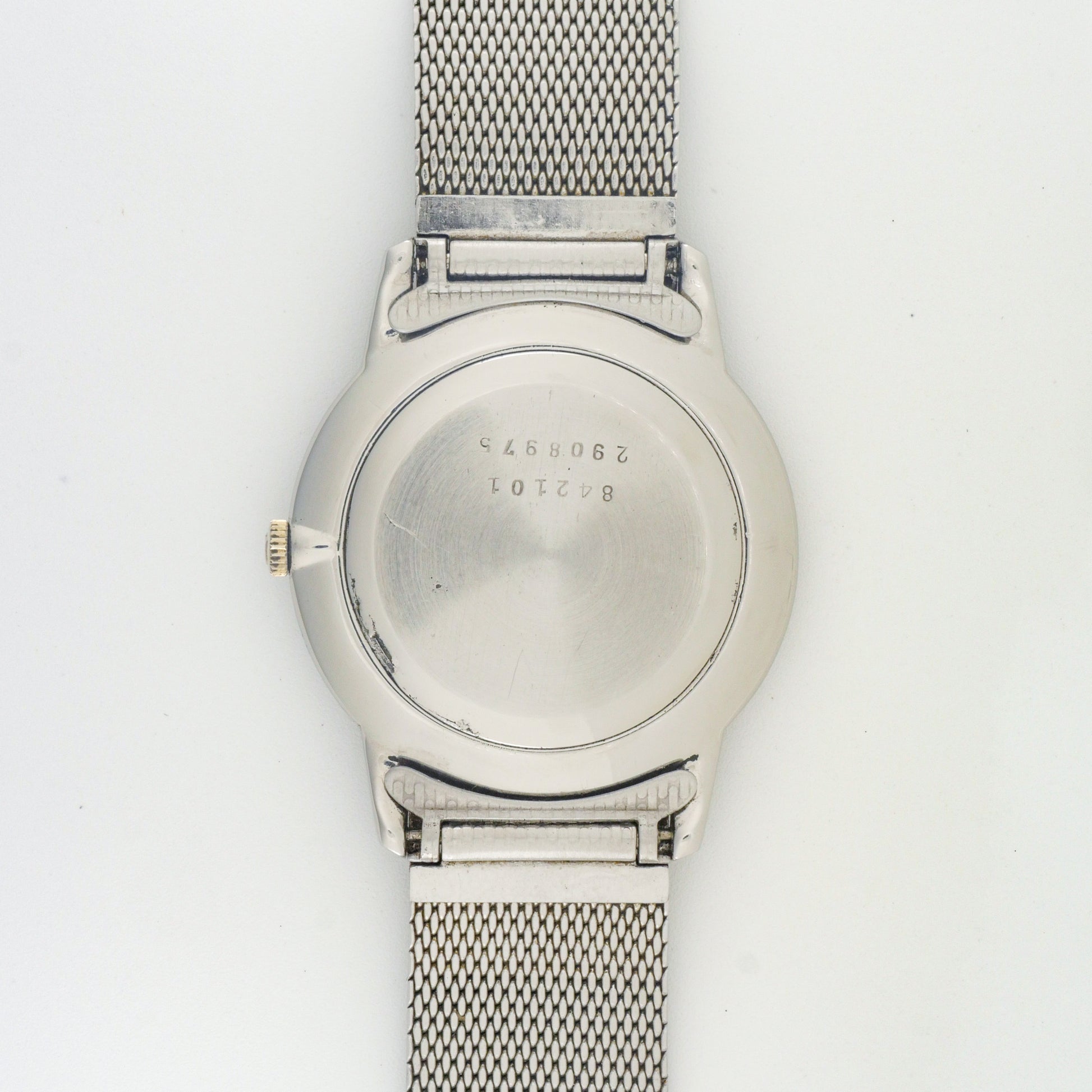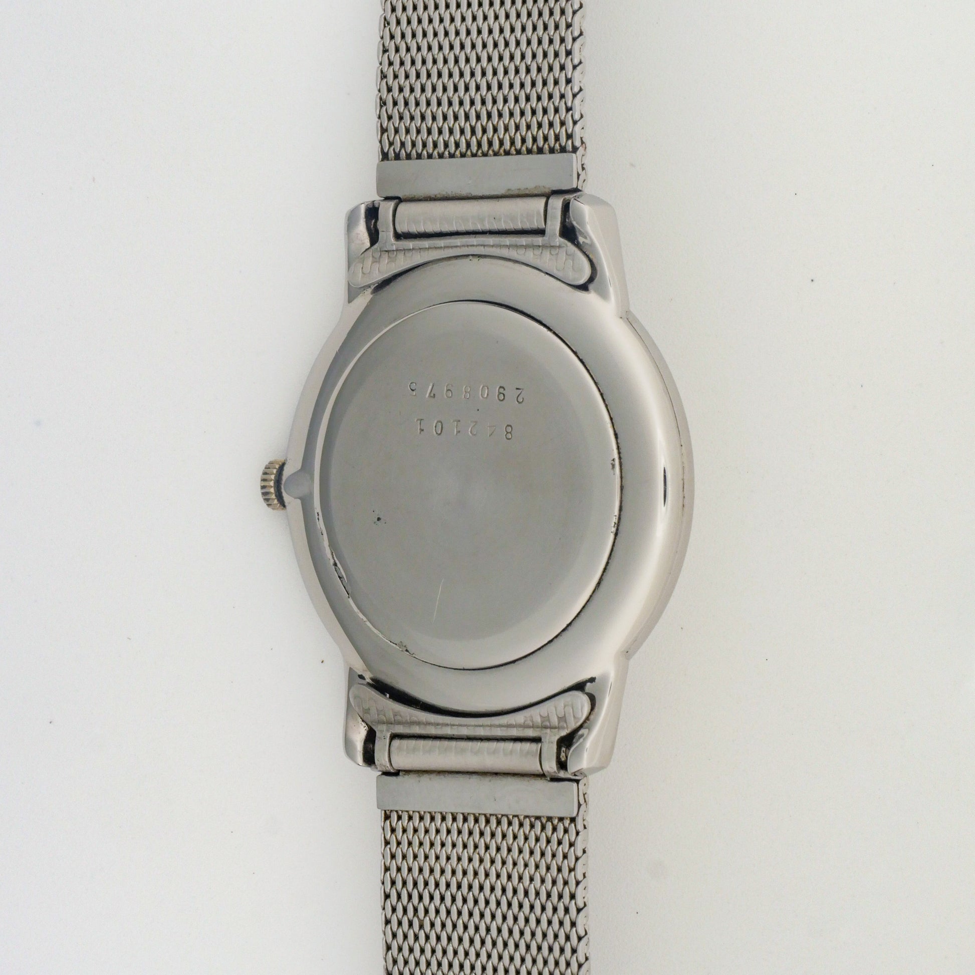 - Case: shows moderate wear with visible scratches, scuffs, and some light tarnishing around the edges and lugs. The silver finish has dulled somewhat, particularly on the case back. Some minor nicks are visible on the case edges.