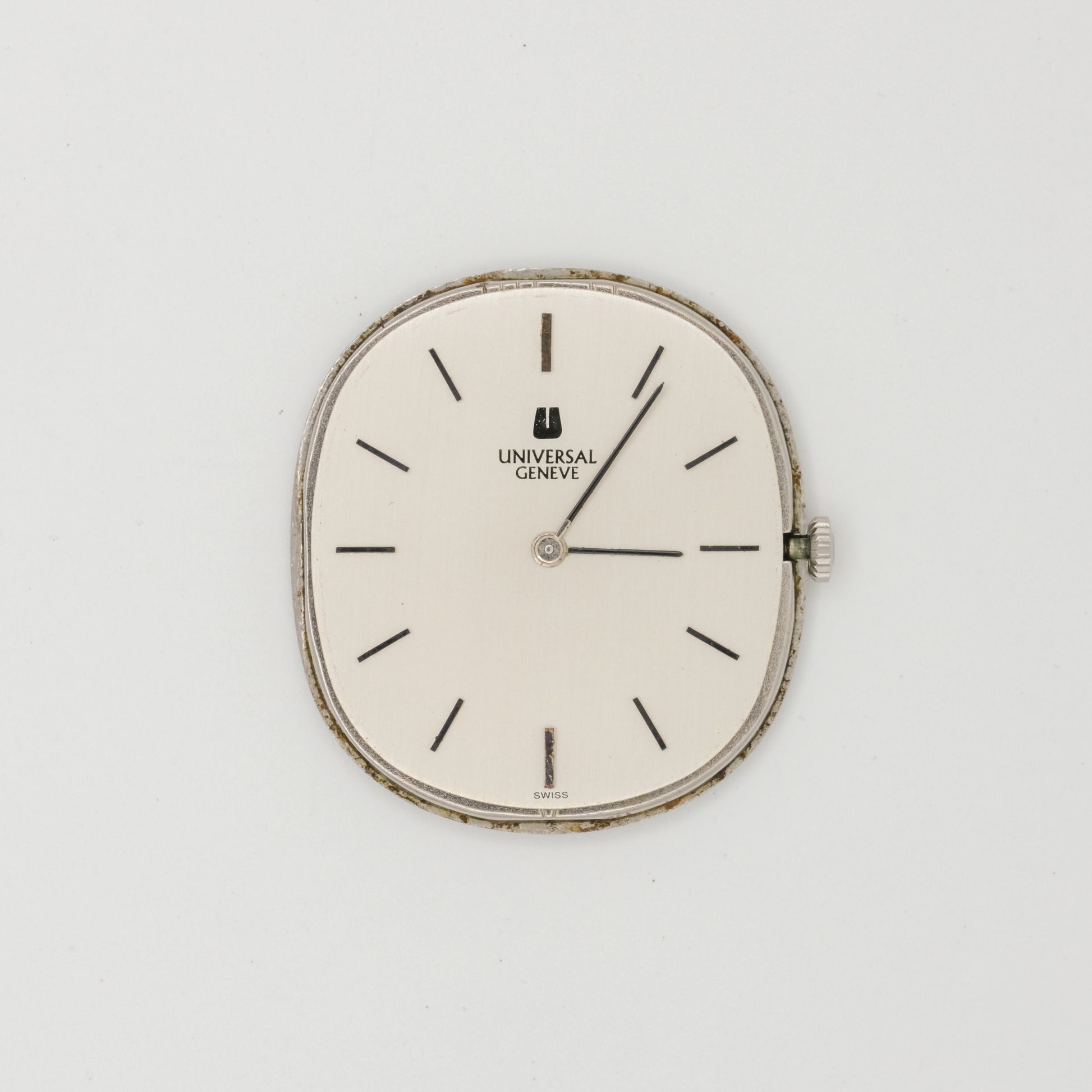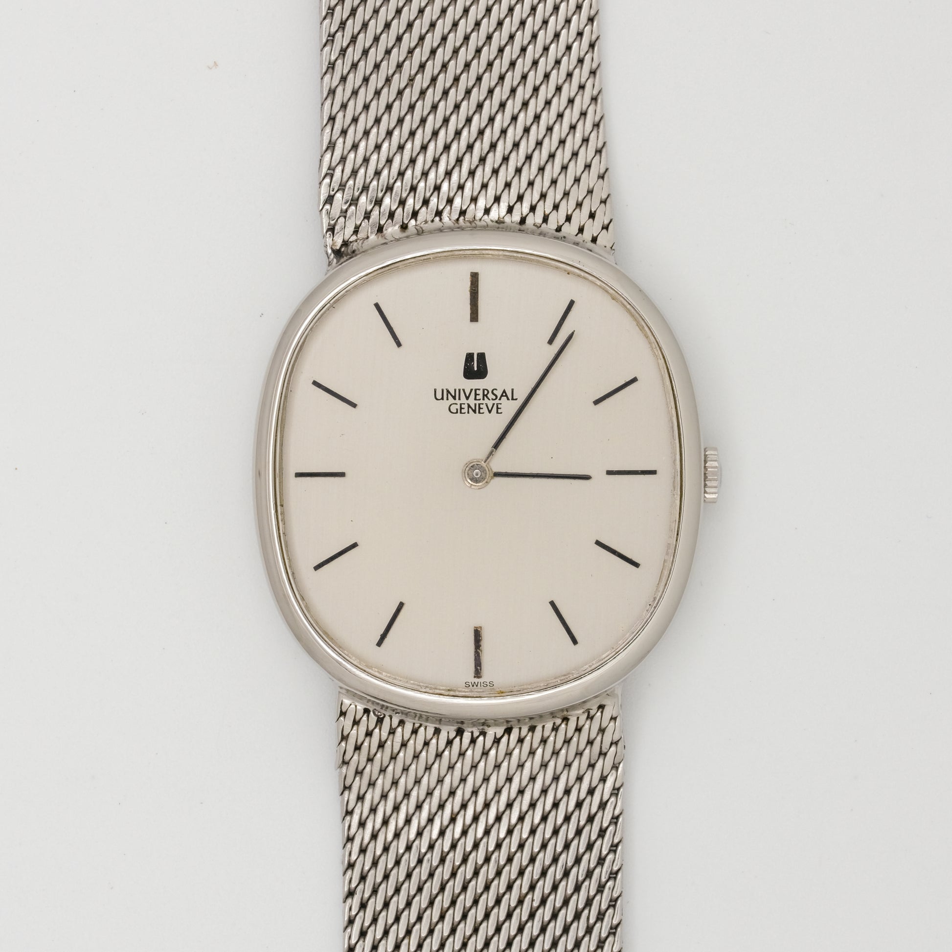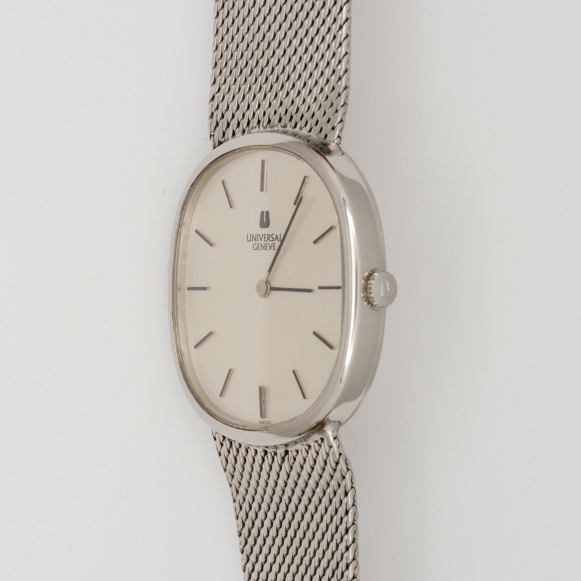 - Dial: in excellent condition, no visible signs of discoloration, fading, or damage to the dial. It has a clean, off-white/cream colored face with simple black hour markers. The Universal Genève logo is crisp and clear.
