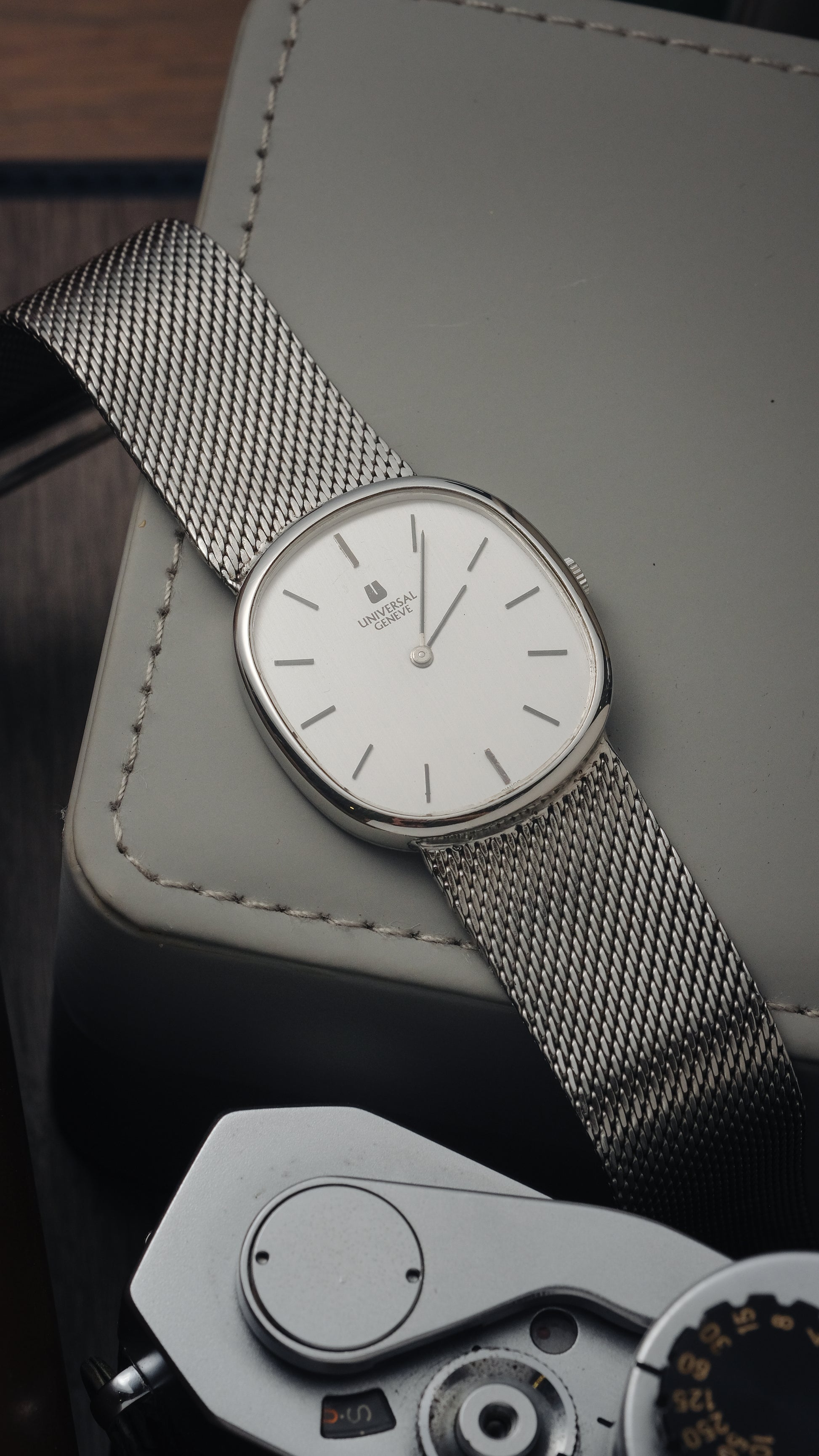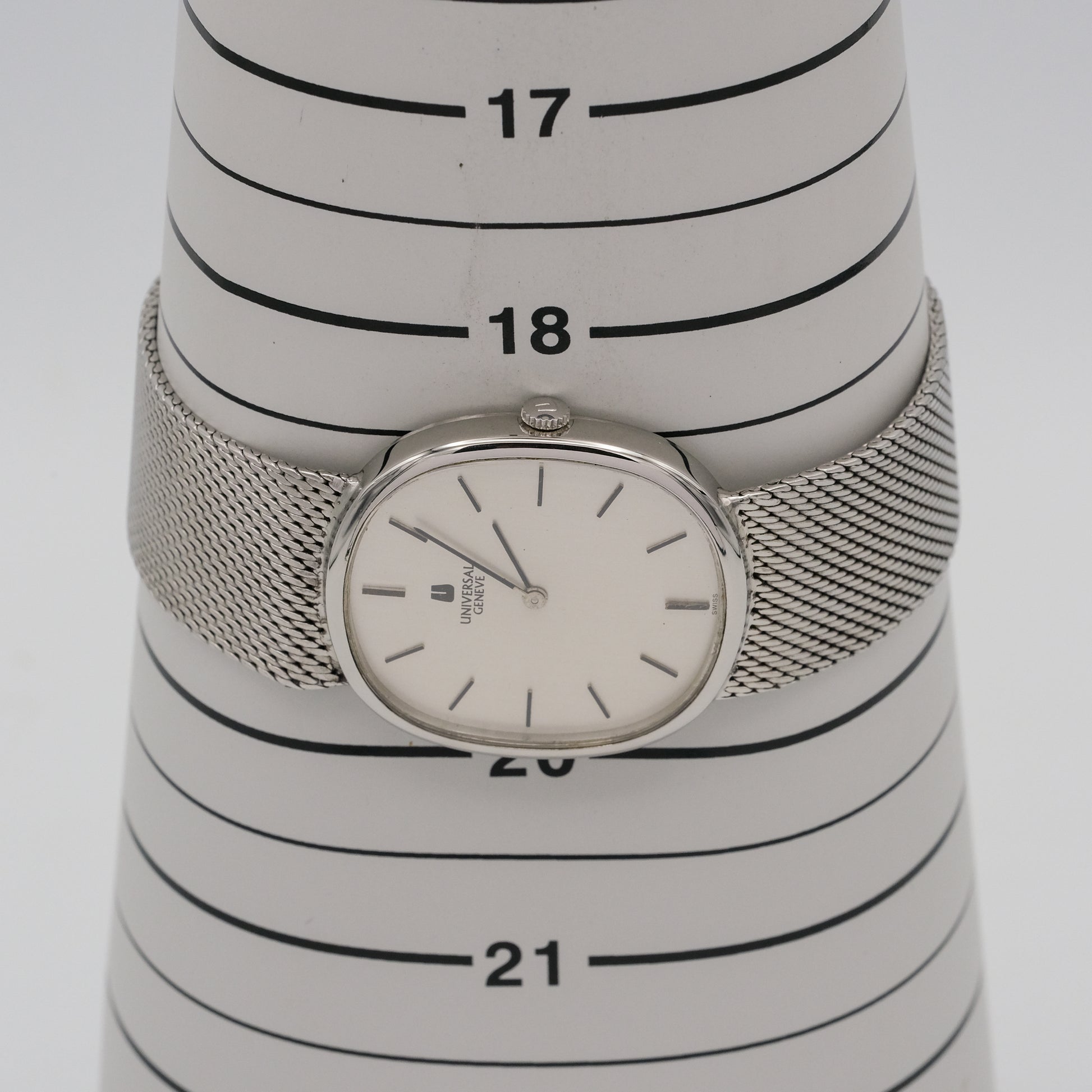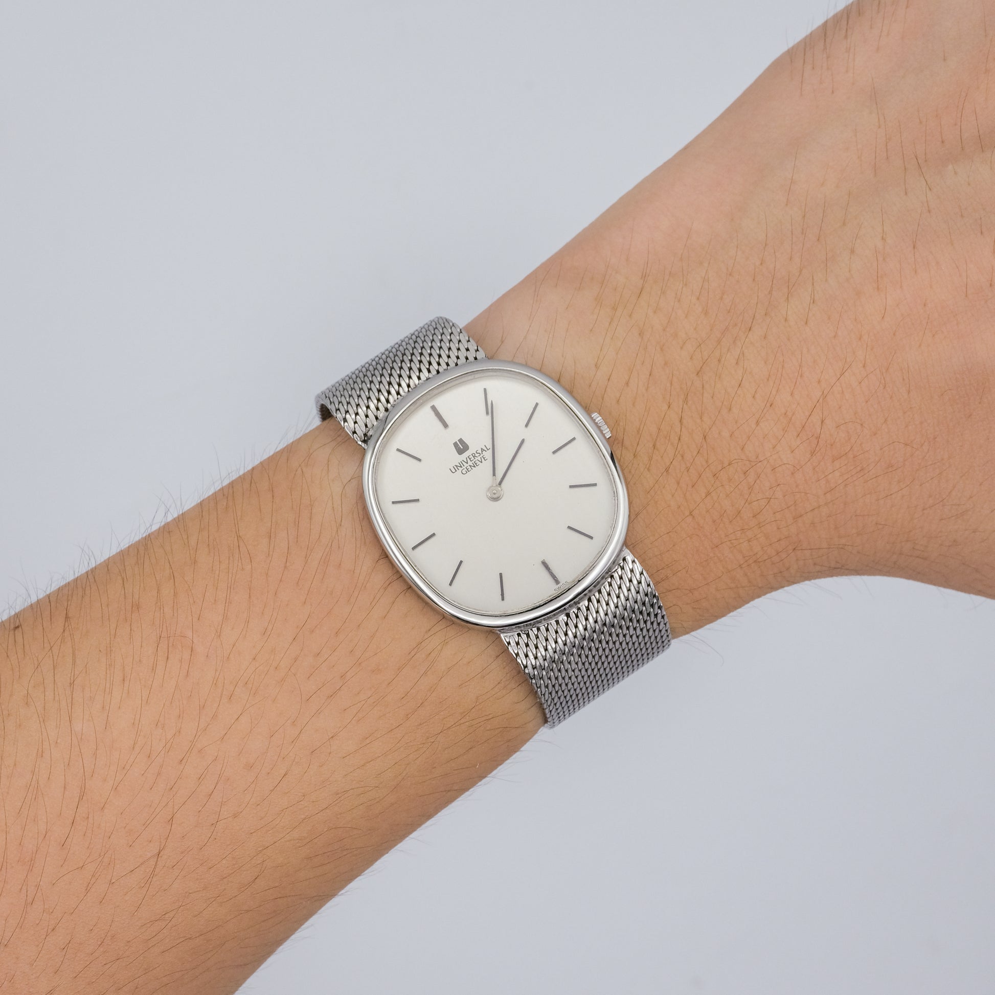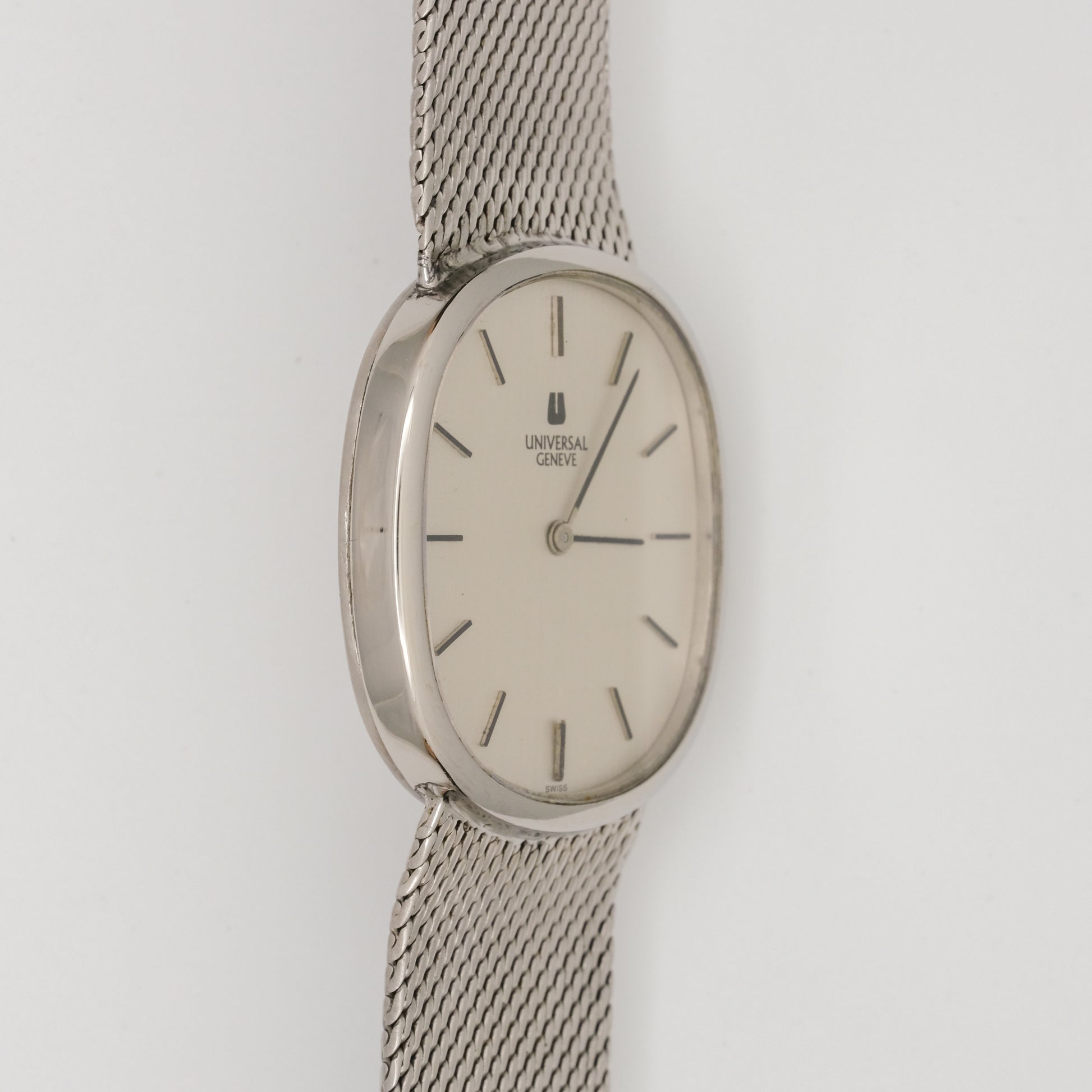 - Dial: in excellent condition, no visible signs of discoloration, fading, or damage to the dial. It has a clean, off-white/cream colored face with simple black hour markers. The Universal Genève logo is crisp and clear.