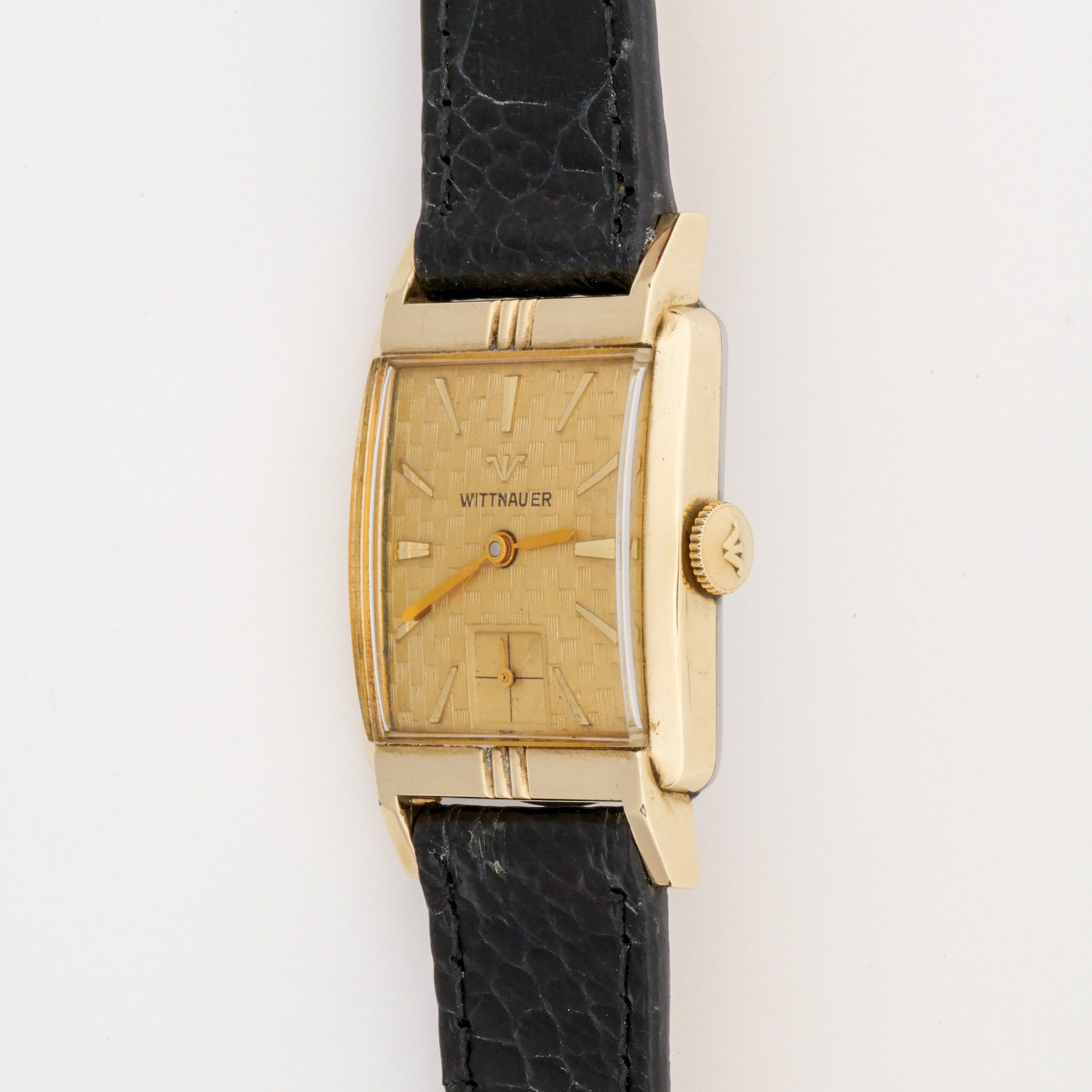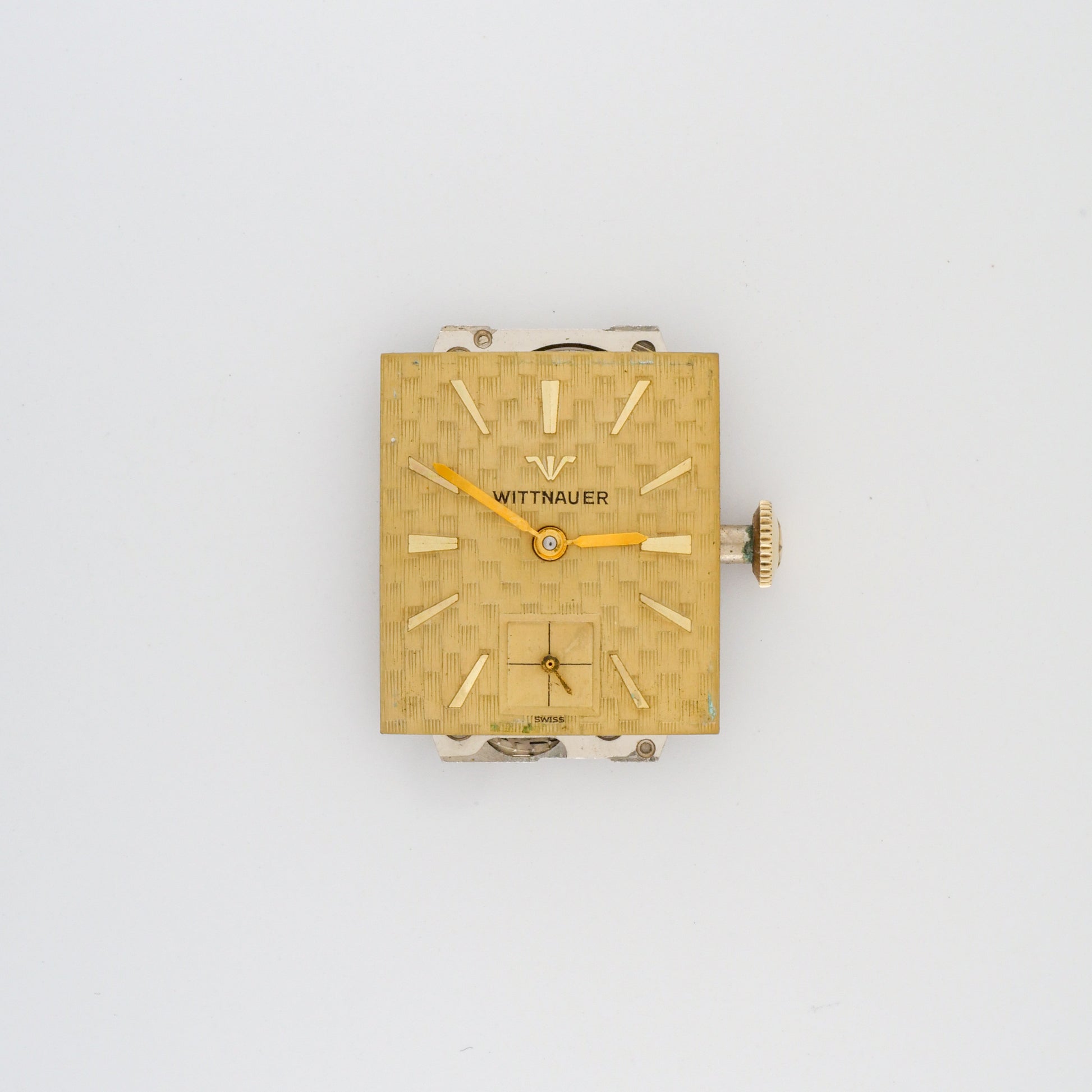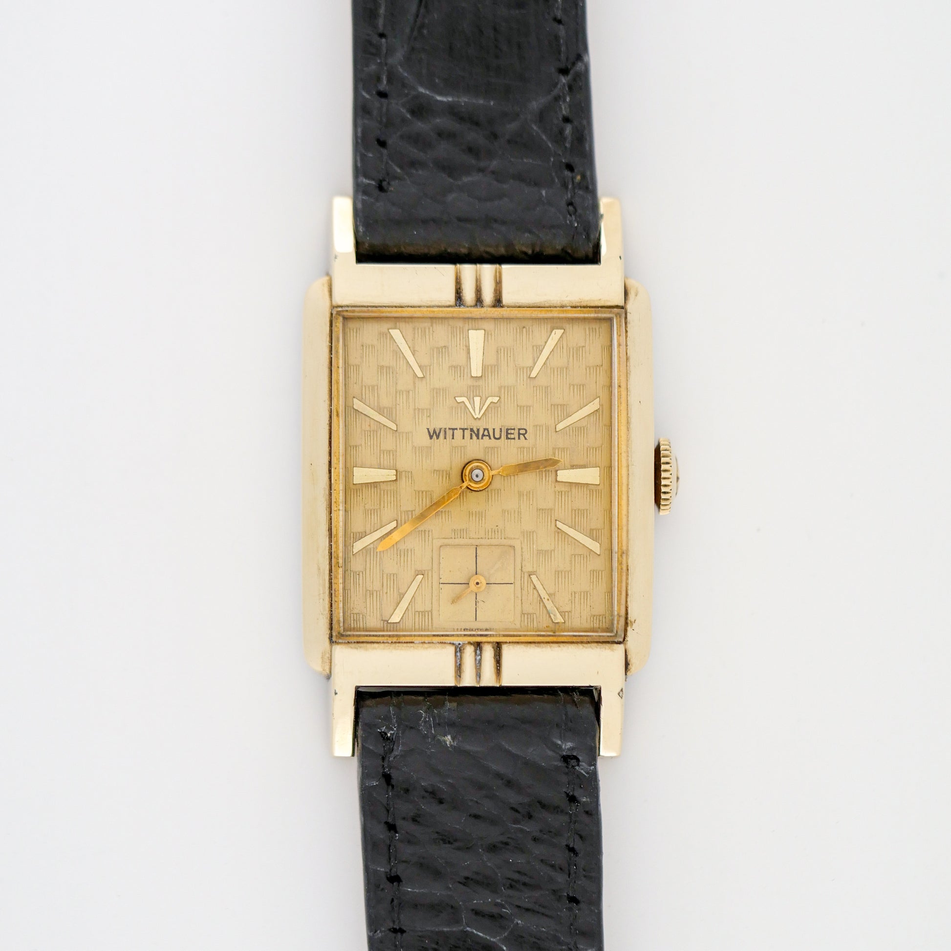 - Dial: has a textured basketweave pattern and displays some aging, with slight patina development. The applied hour markers and Wittnauer logo remain intact and legible. The small second at 6 o'clock is well-preserved, and the original gold-toned hands are in good condition without significant oxidation.