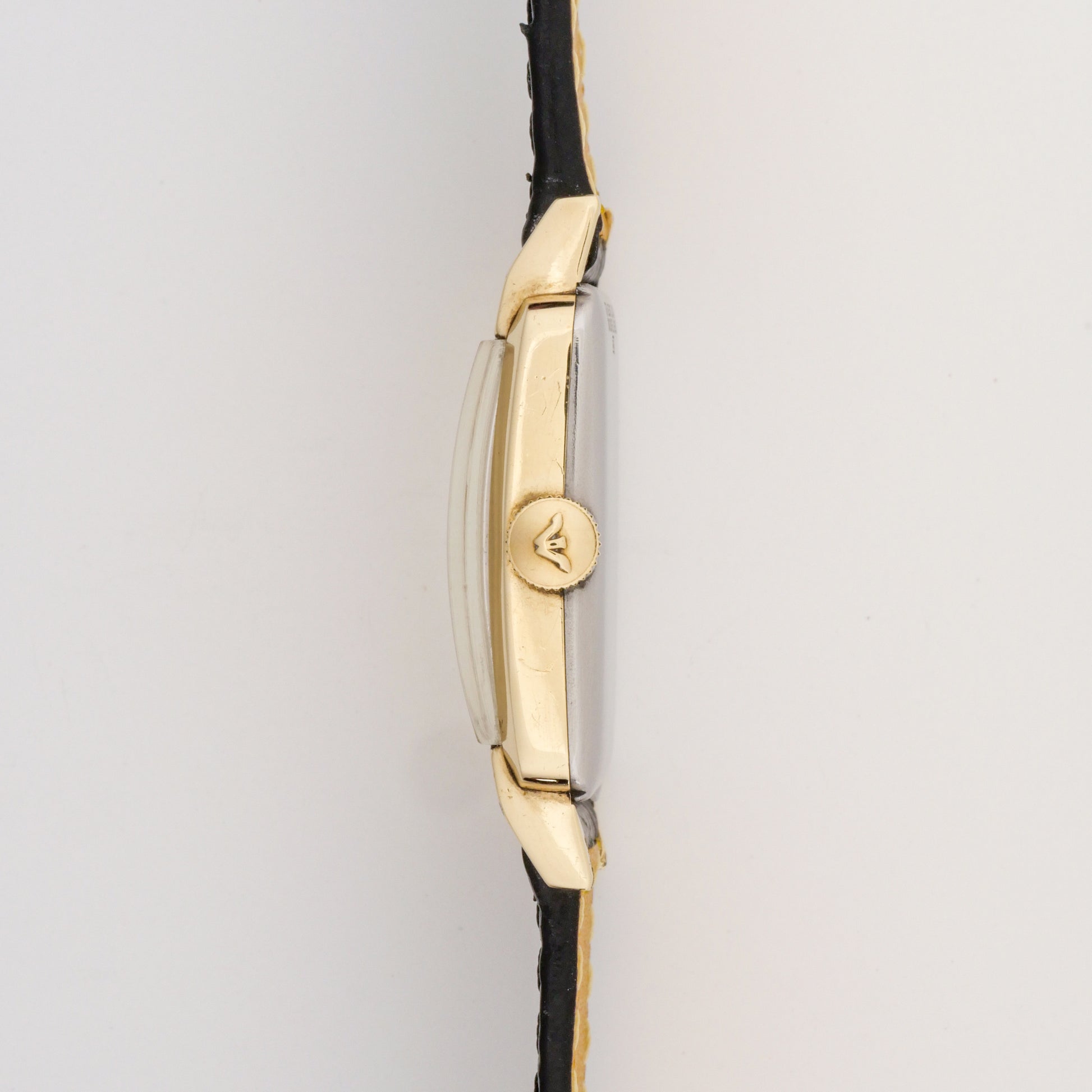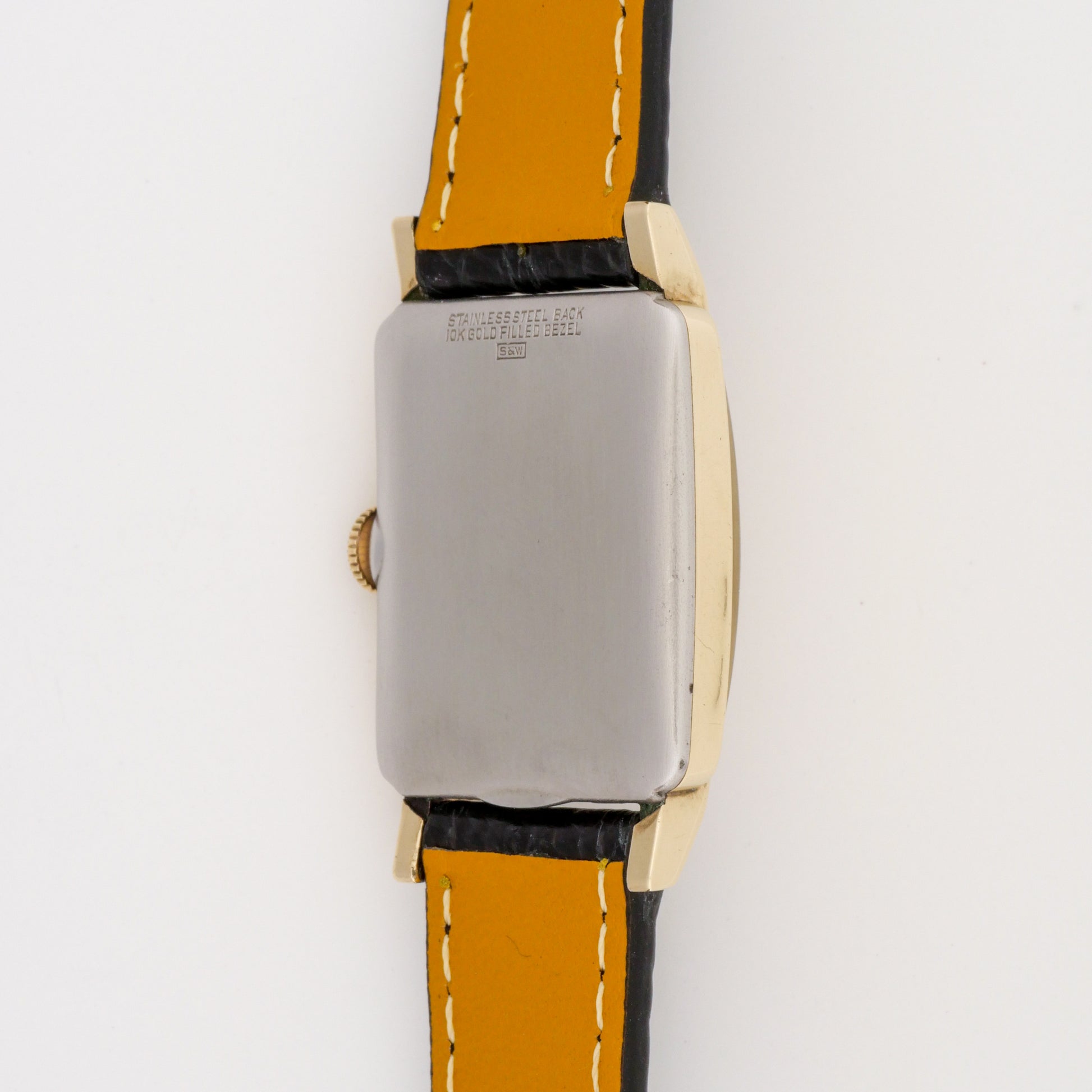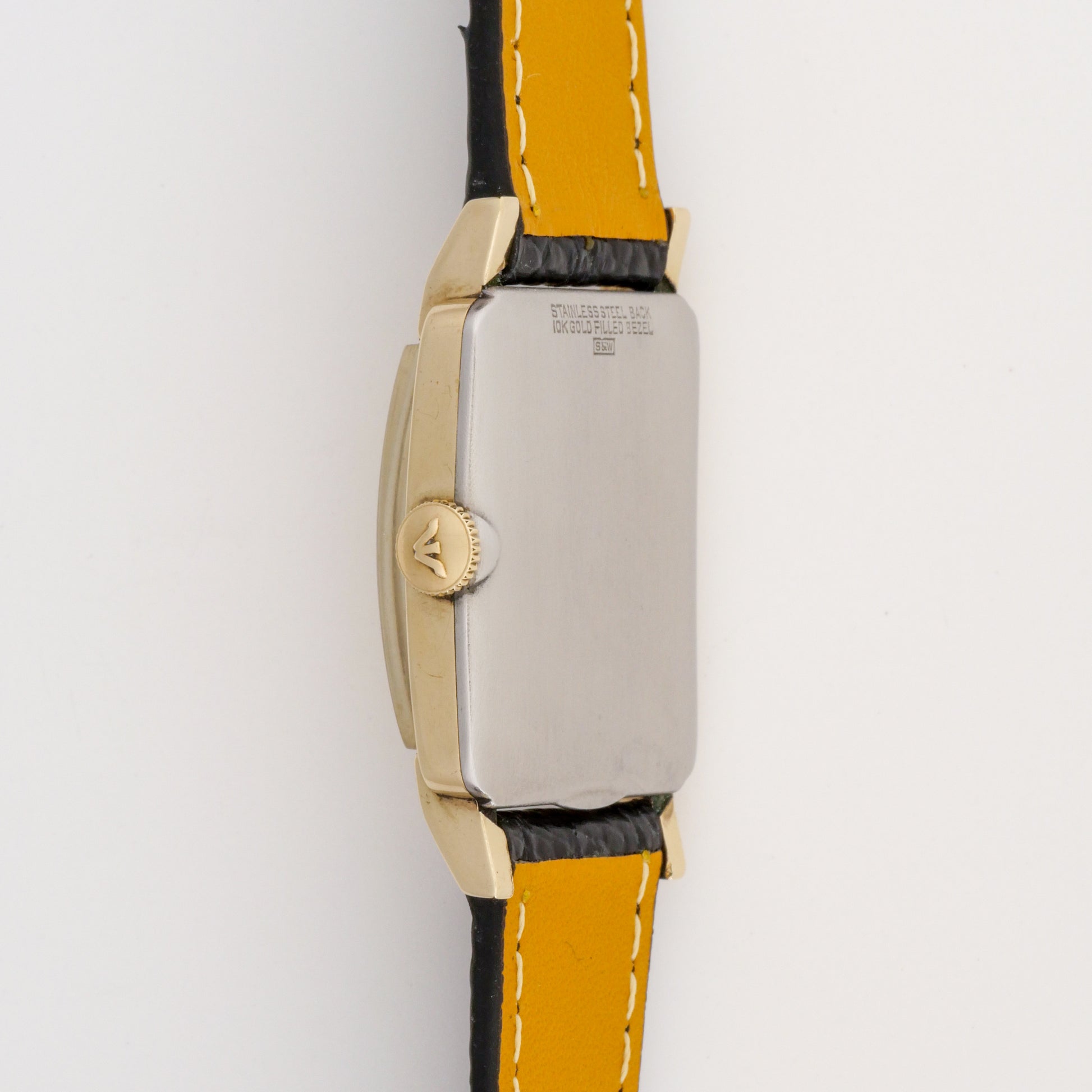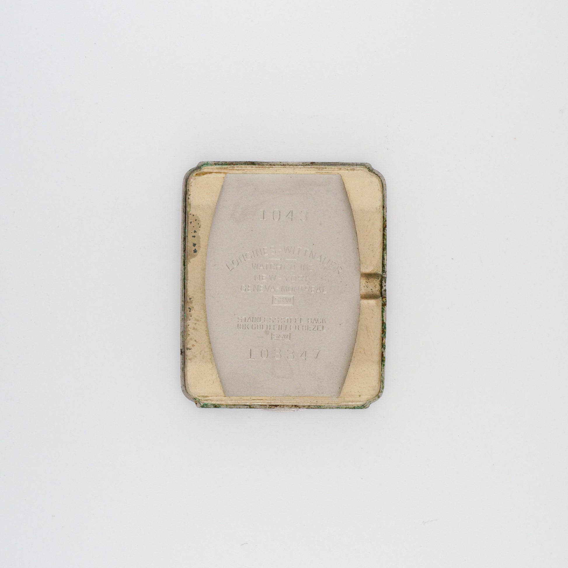 - Case: shows moderate wear consistent with its age, including some surface scratches and light patina on the gold finish. The case retains its original rectangular shape and distinctive Art Deco-style design elements, with decorative lines on the lugs. The case back is in good condition with clear markings.