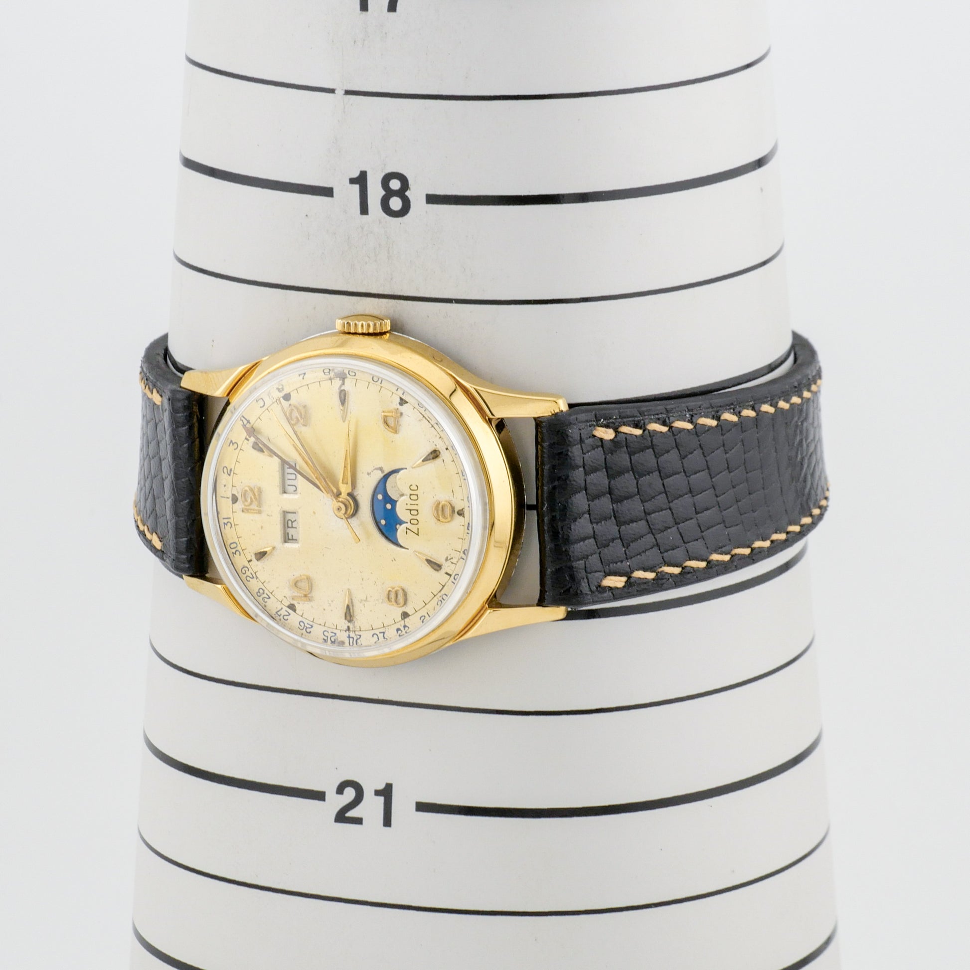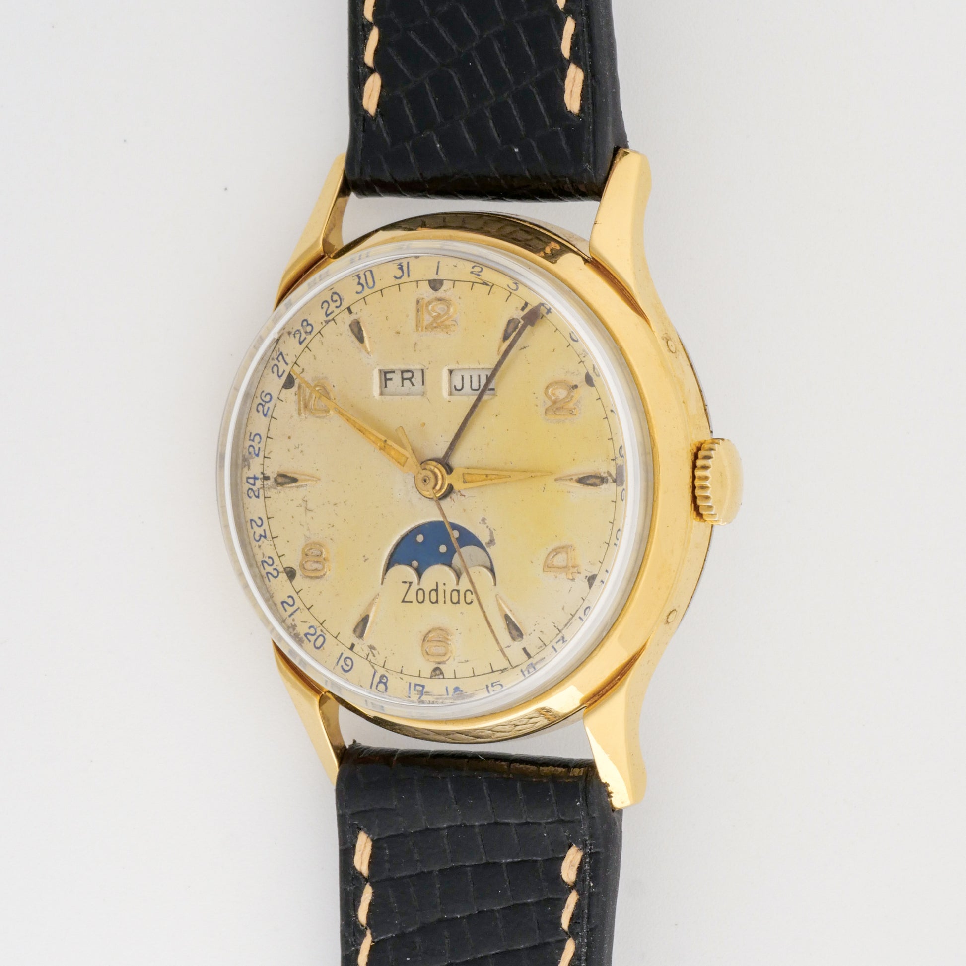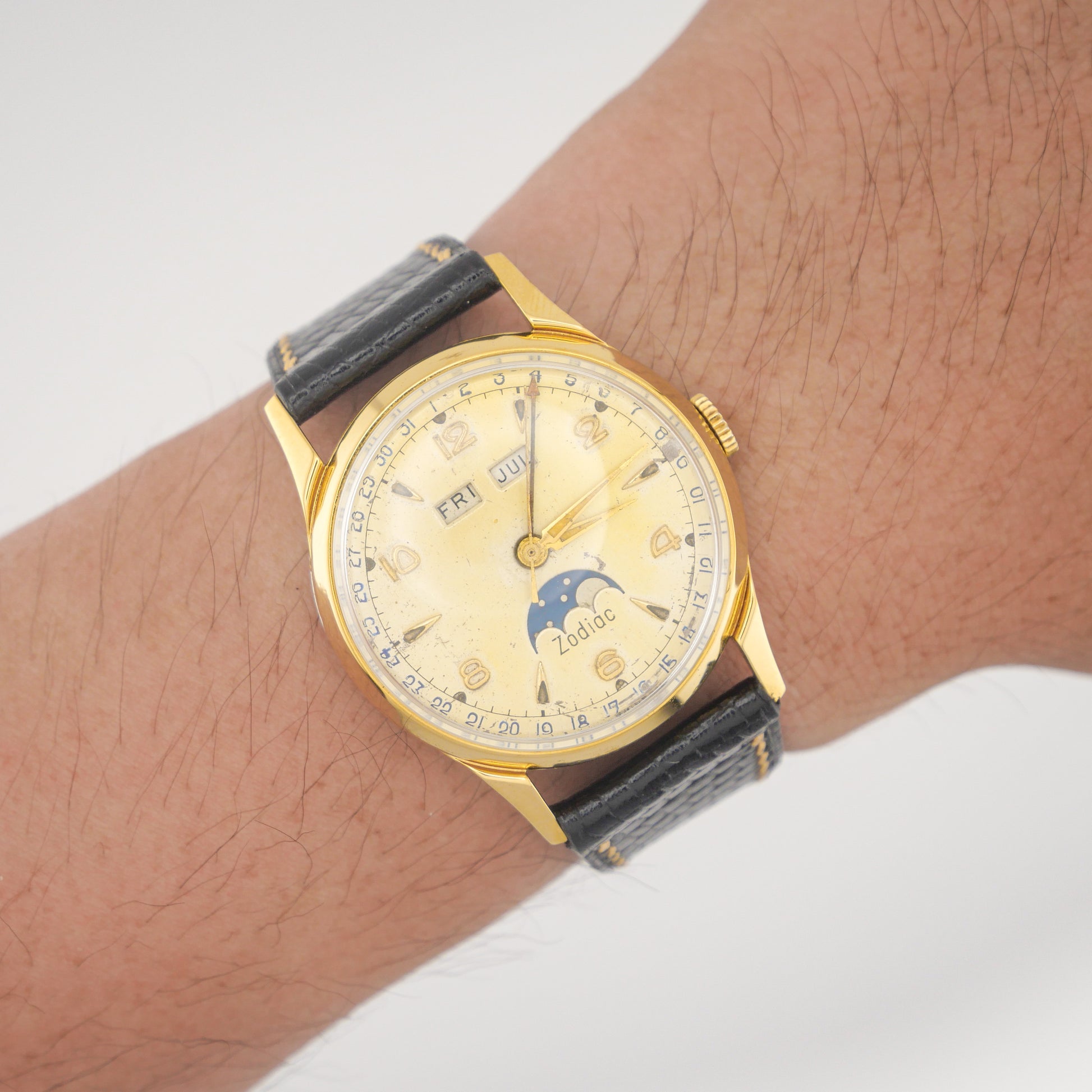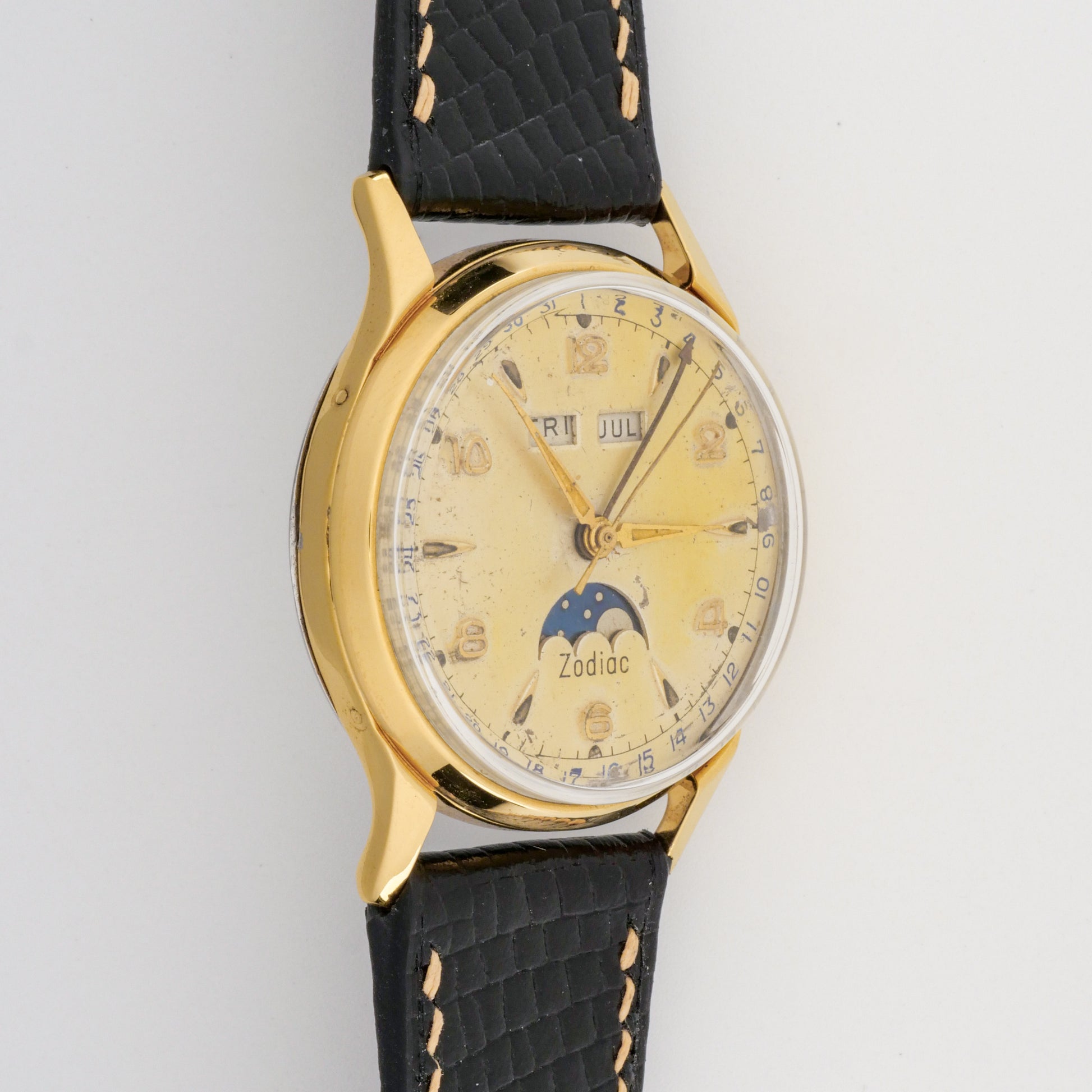 - Dial: exhibits notable aging with a warm patina and some spotting/oxidation marks throughout. The gold indices and numerals remain legible but show slight tarnishing. The moon phase indicator is well-preserved with good color retention despite its age. The Zodiac logo remains clearly visible above the moon phase.